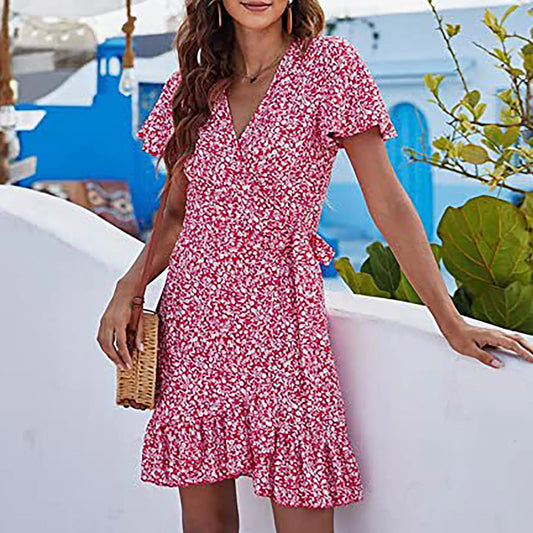 JuliaFashion - Floral Edge Short Sleeved Women High Waist Female Simple Ruffles Hem Short V Neck Holiday Vacation Casual Dress