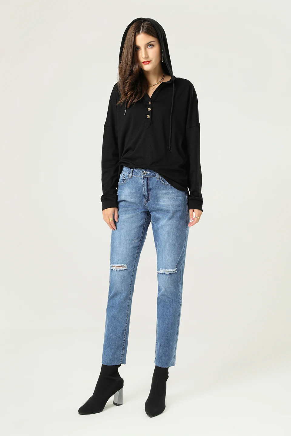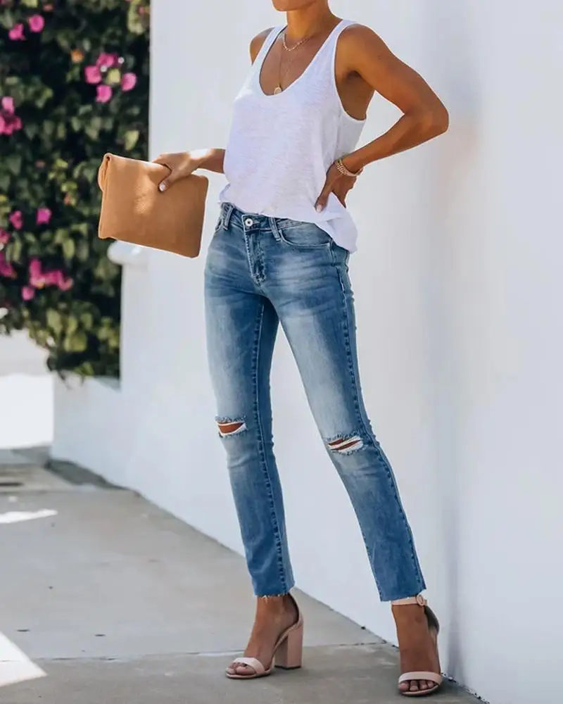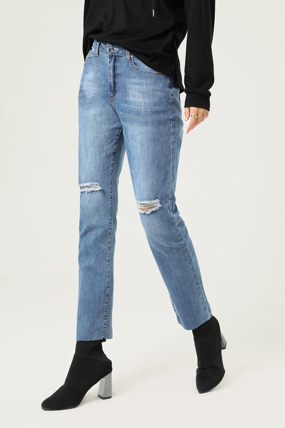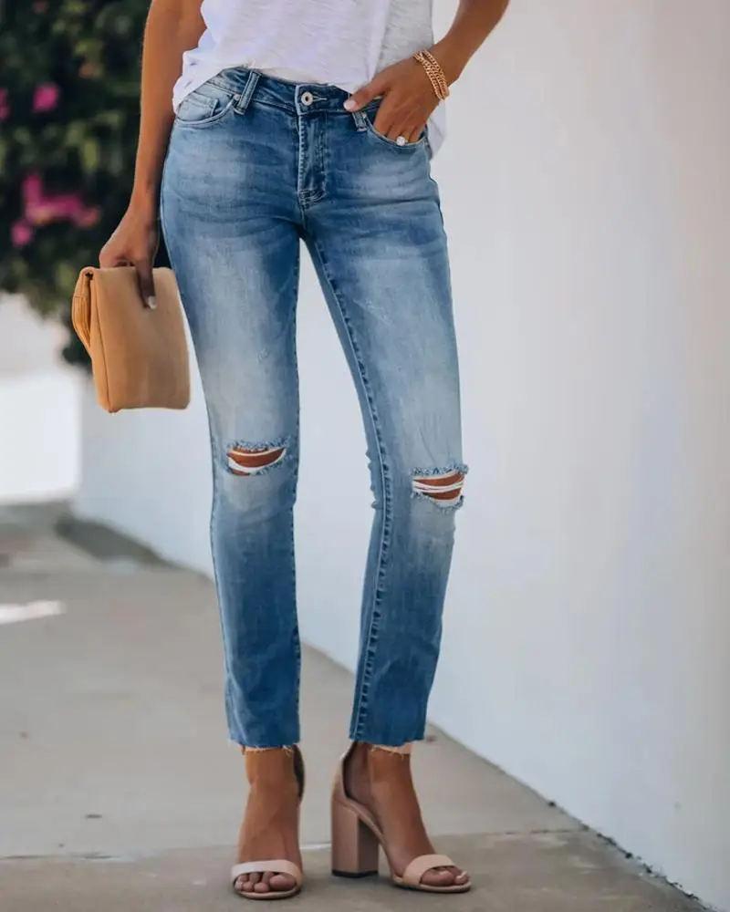 Julia Fashion - Women's Jeans Mid Waist Ripped Denim Pants