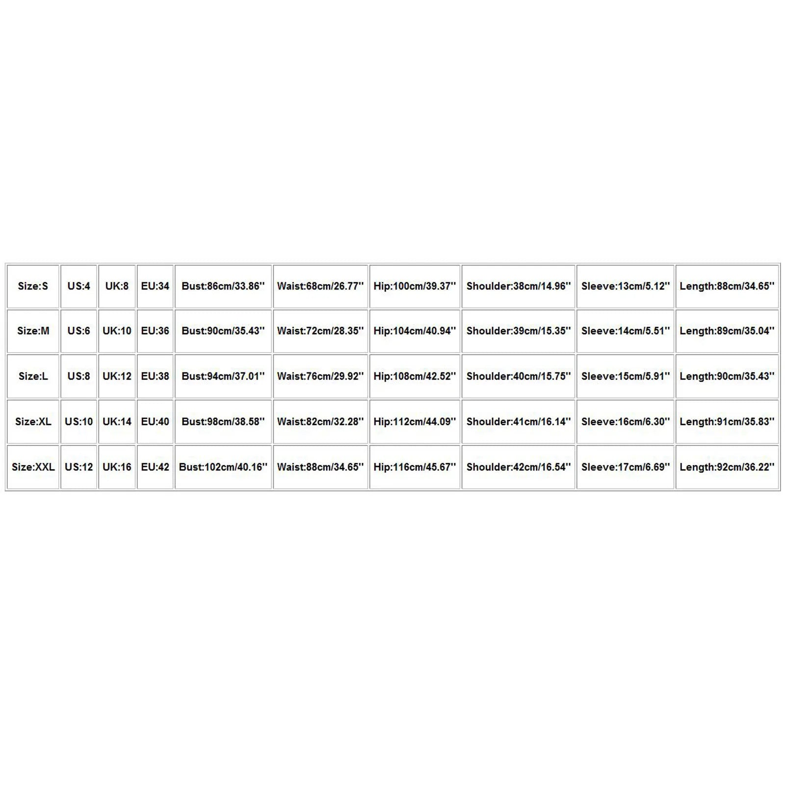 | Size | US | UK | EU | Bust | Waist | Hip | Shoulder | Sleeve | Length |