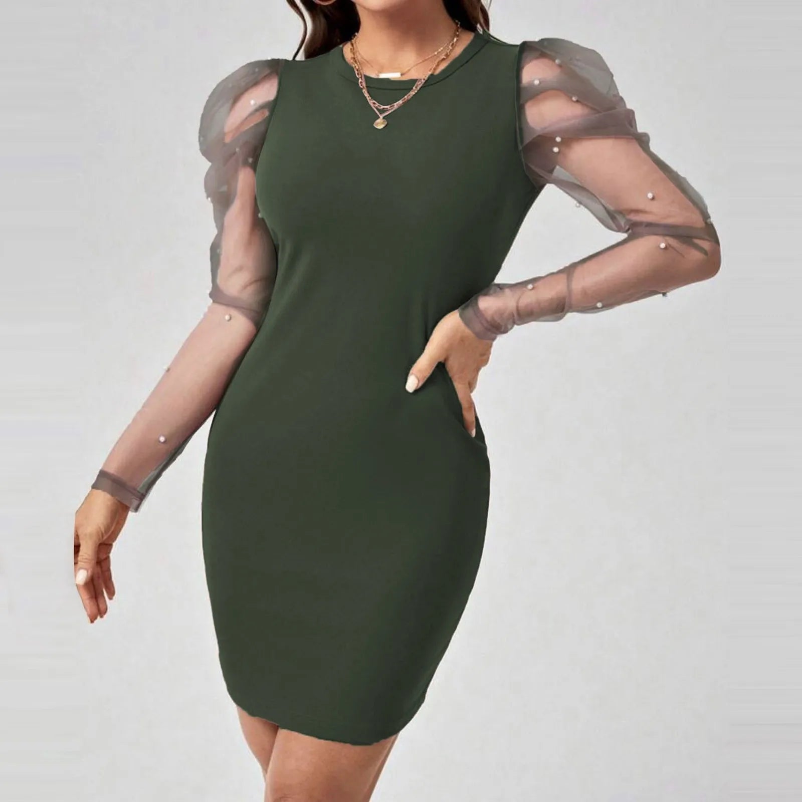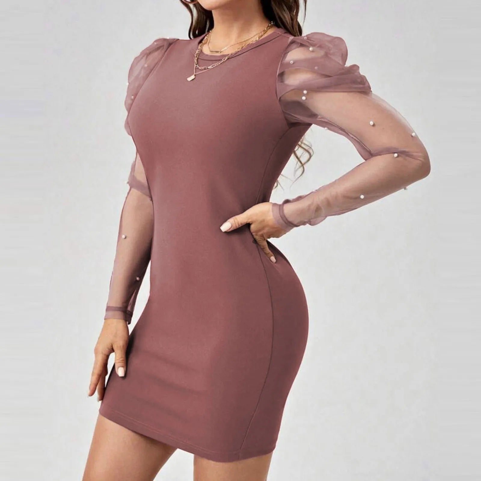 JuliaFashion - 2024 Elegant Mesh Long Sleeve Bodycon For Women Fashion Party Solid Color Round Neck Slim Fit Hip Cocktail Dress