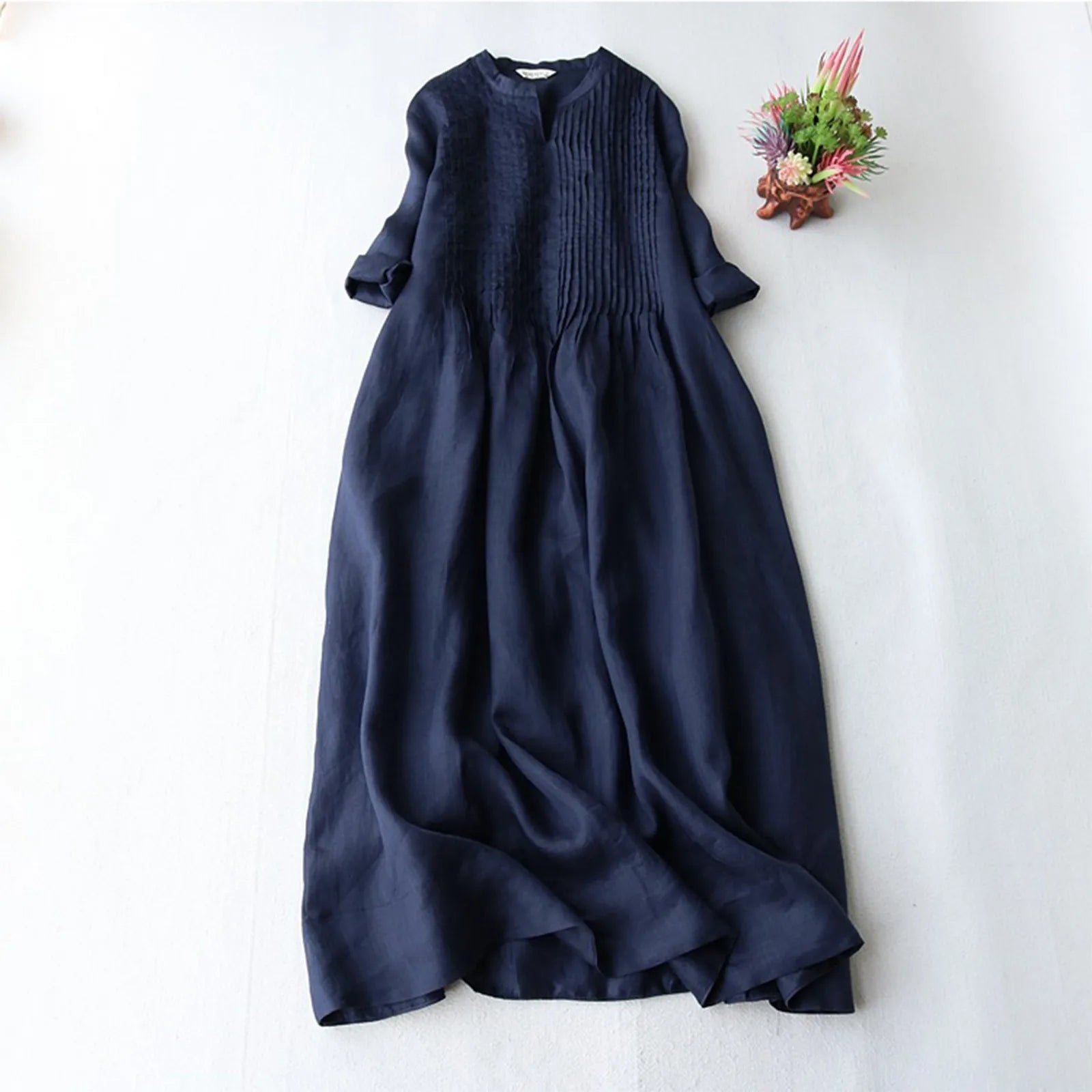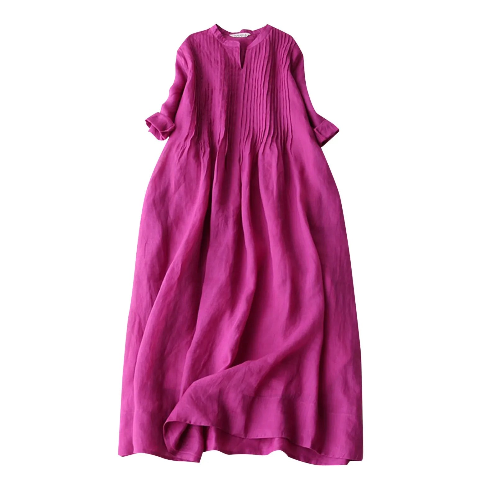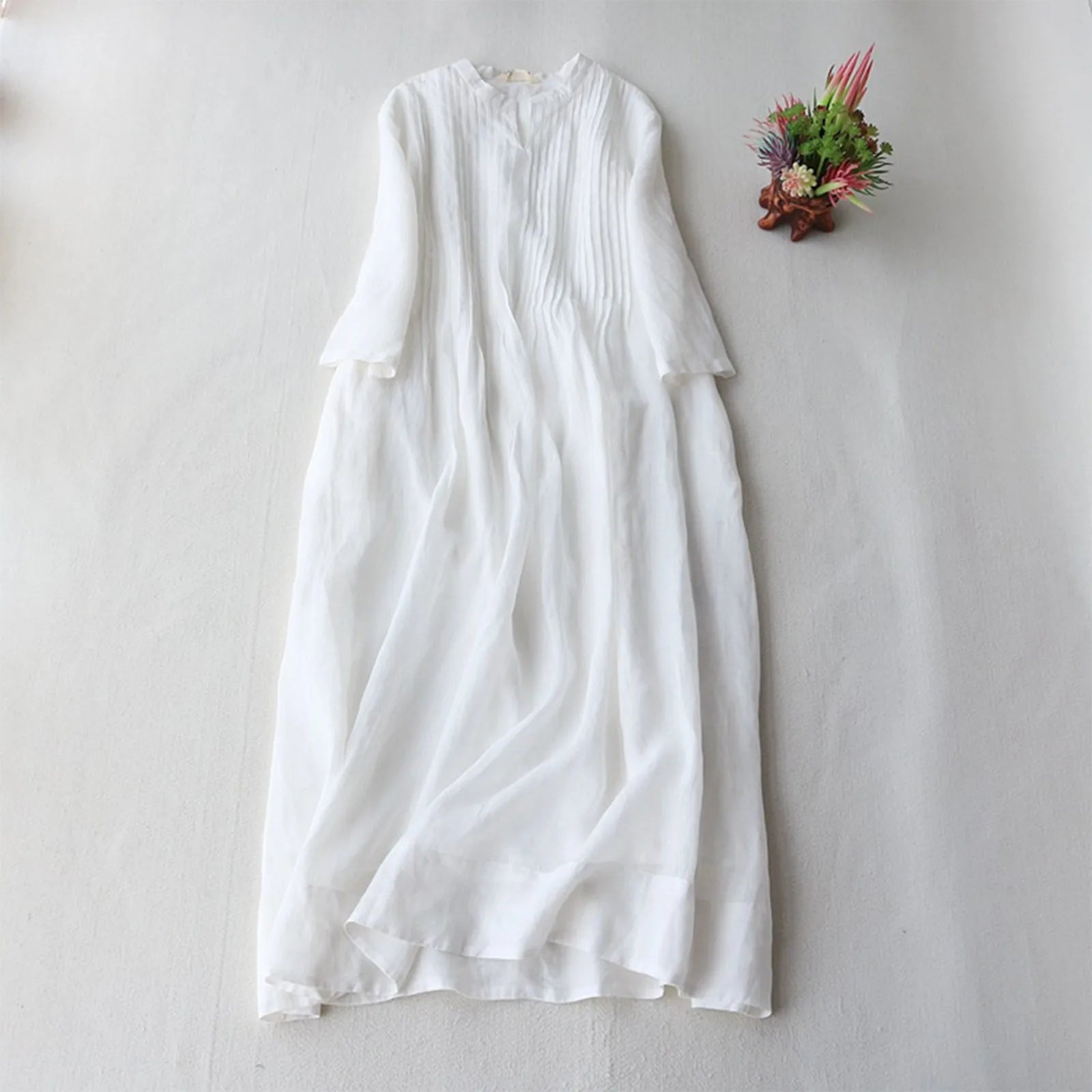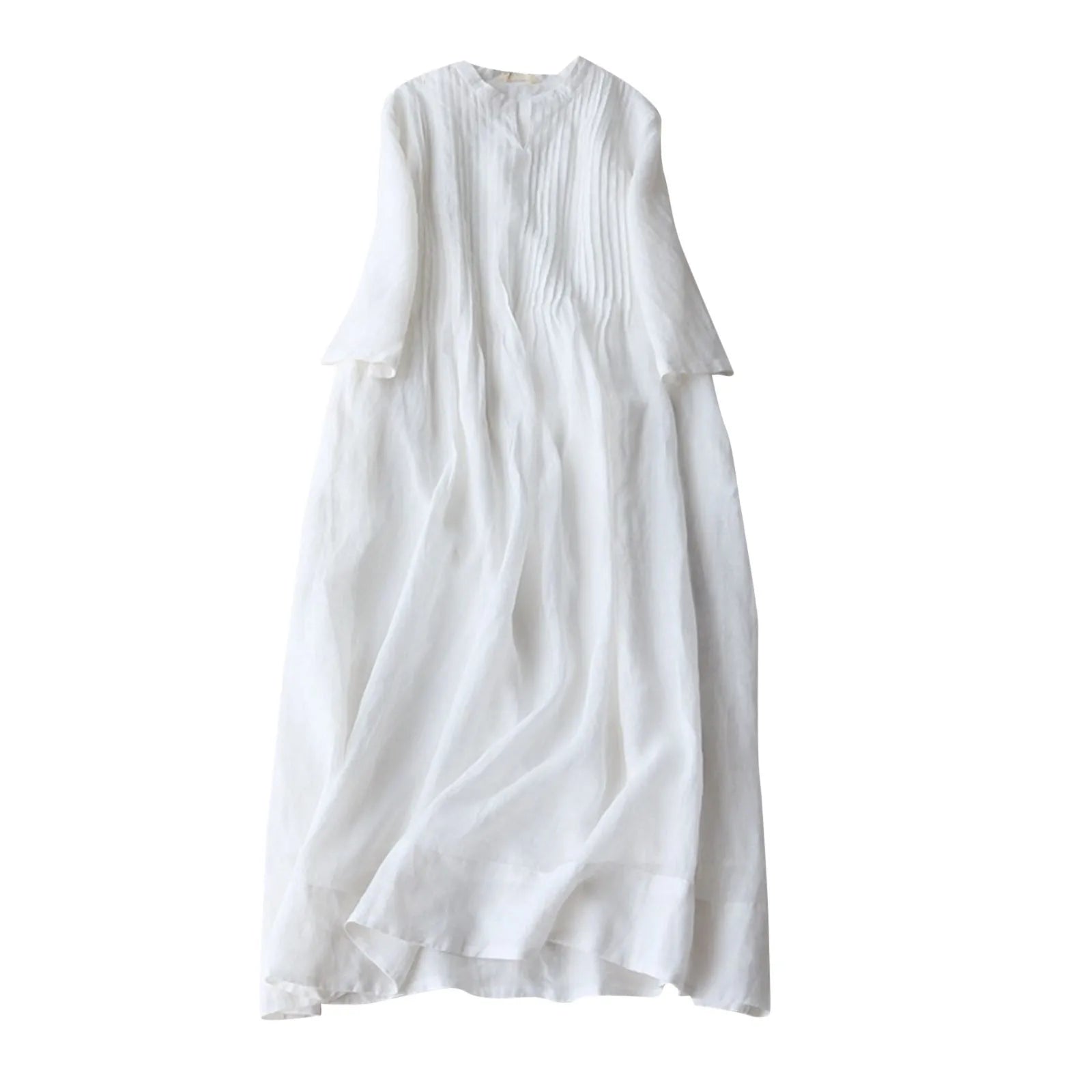 JuliaFashion - 2024 Summer New Ladies Cotton Linen Fashion Women's Thin Ramie Elegant Organ Pleated Loose Flowy Short Sleeve Casual Dress