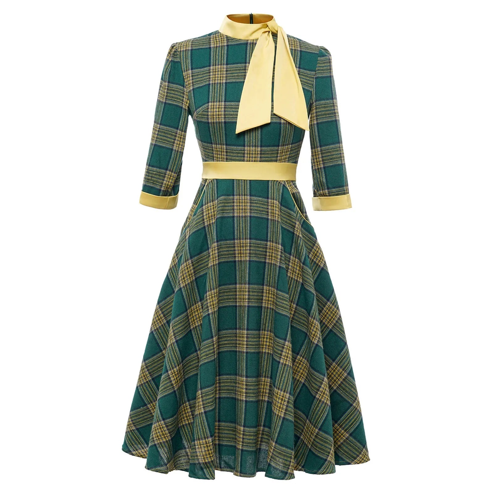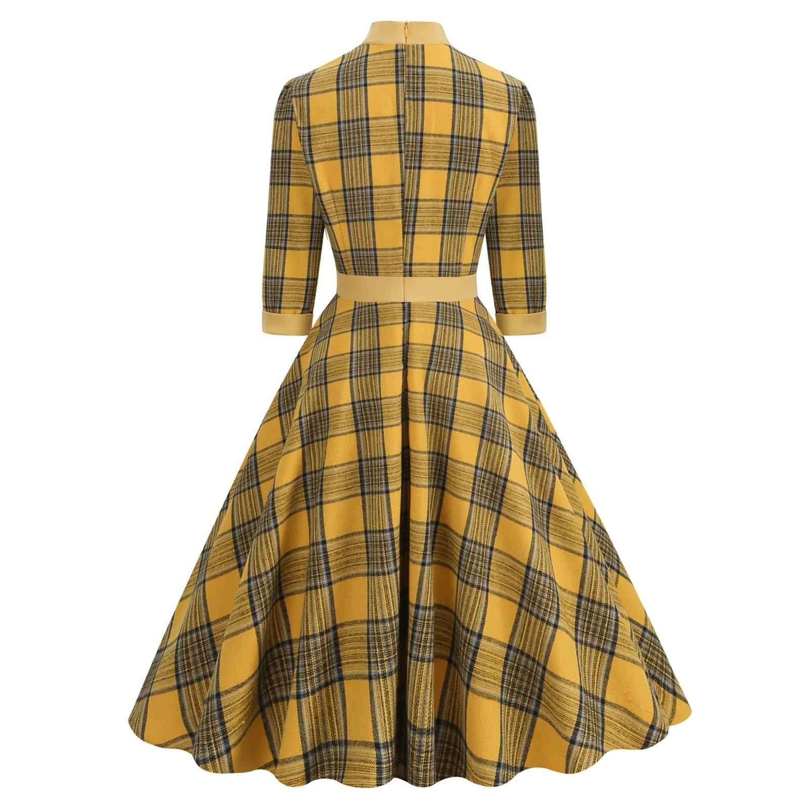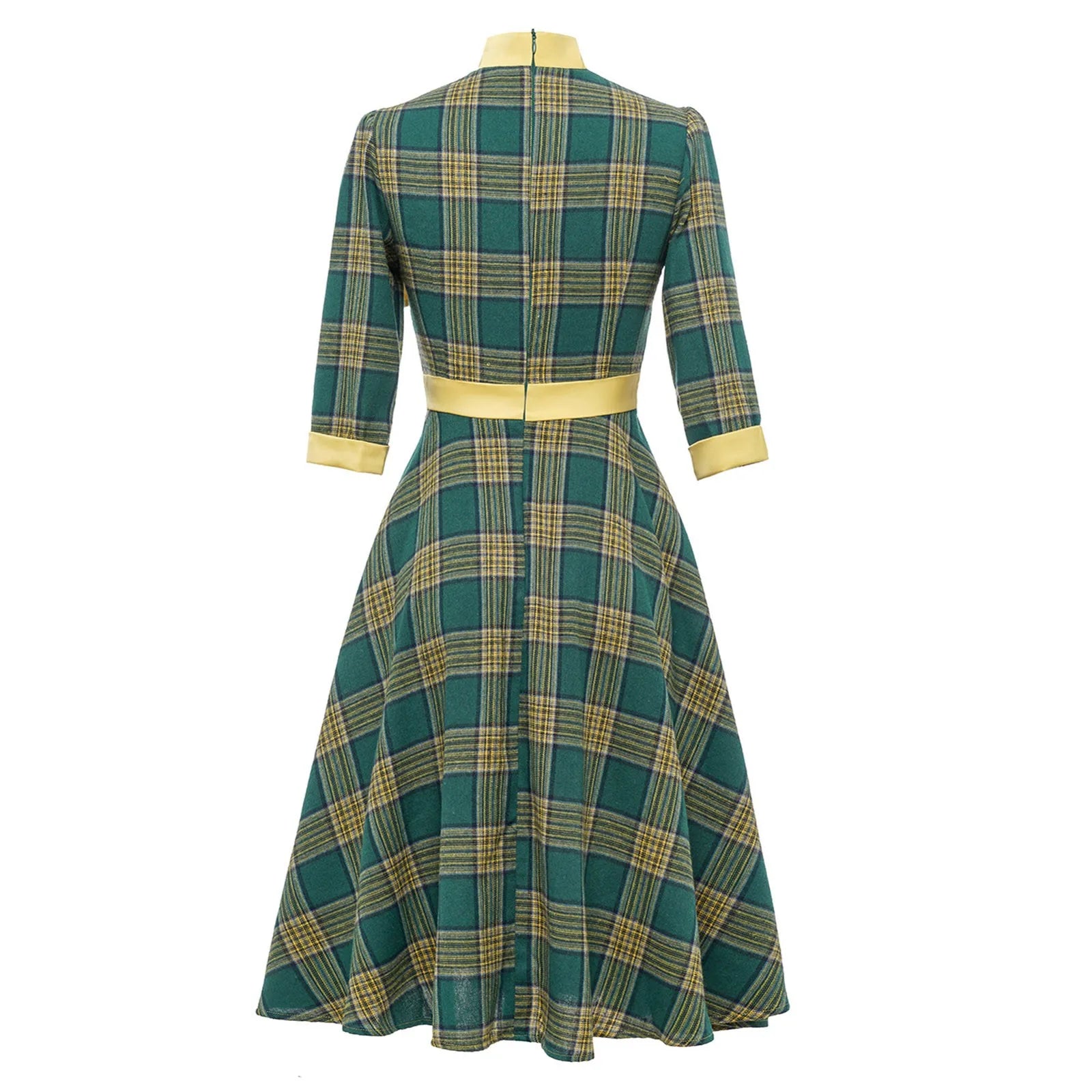 JuliaFashion - Autumn Winter Plaid Turtleneck Retro Pocket Side Dress