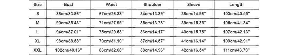 | Size | Bust | Waist | Shoulder | Sleeve | Length |