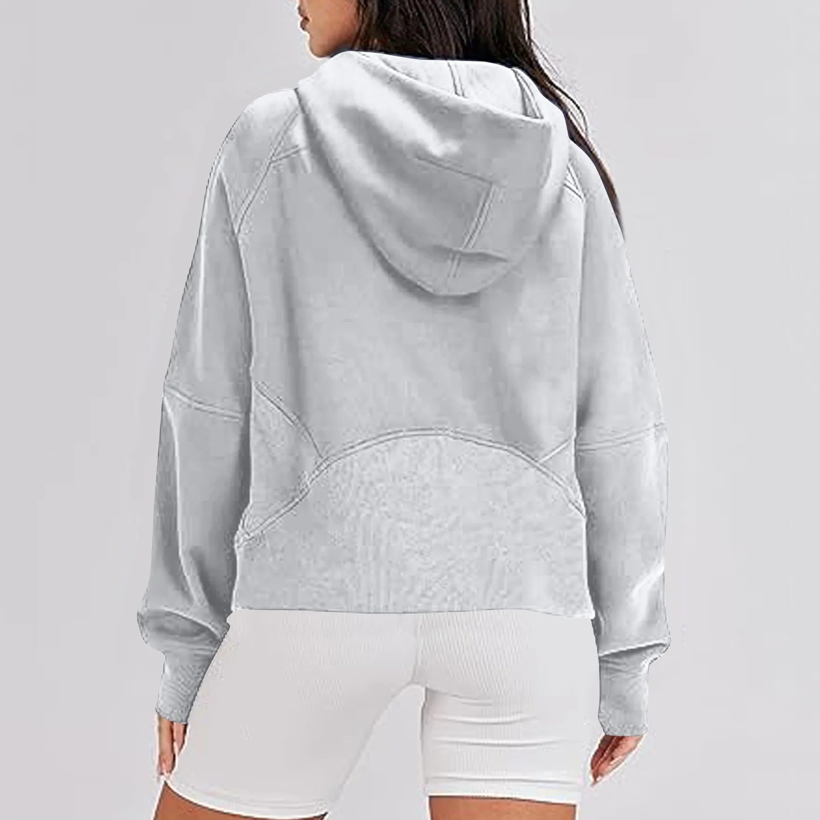 Autumn Winter Solid Color Loose Half Zip Pockets Thumb Hole Long Sleeve Hoody