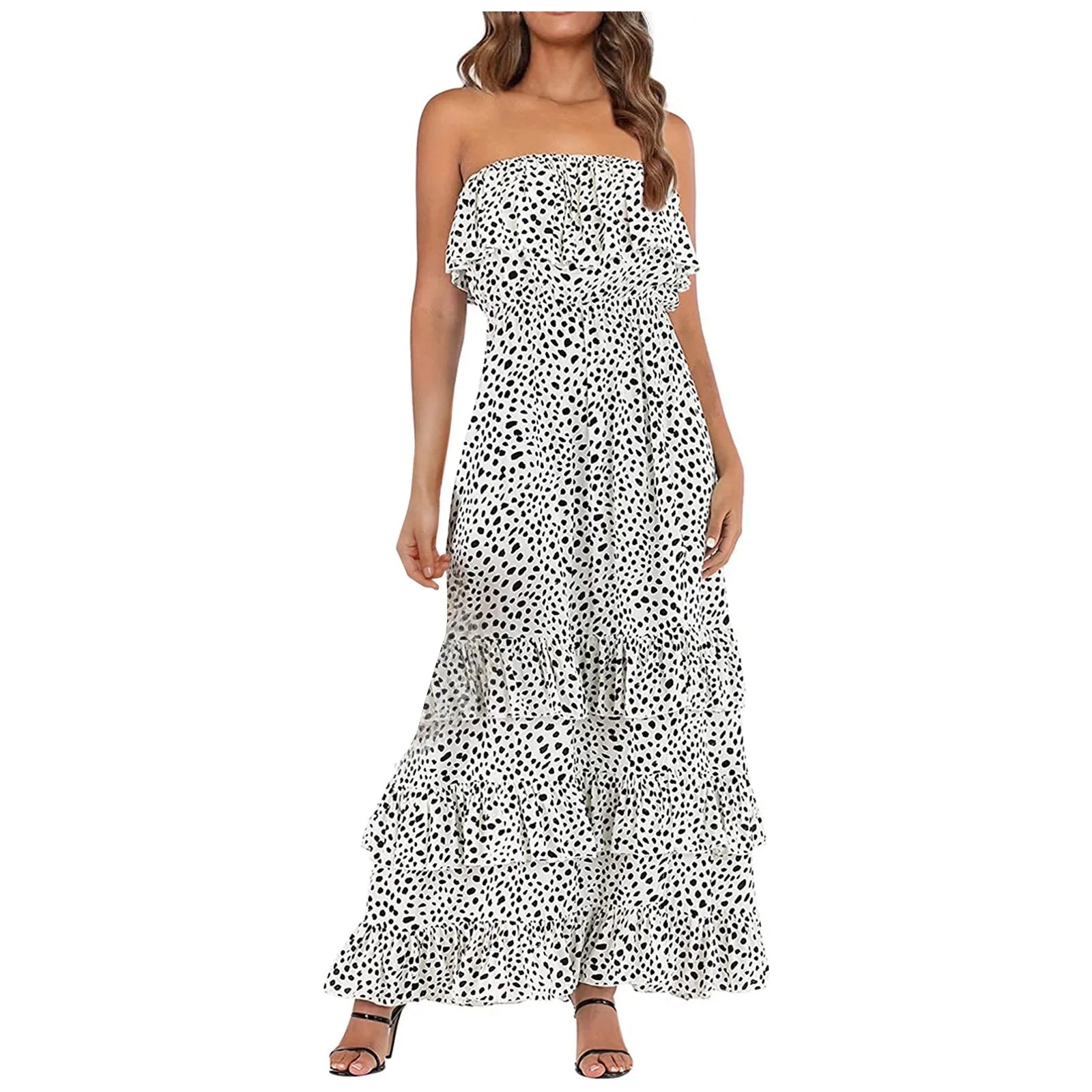 JuliaFashion - Bohemian Floral Ruffle Hem Strapless Maxi Women Elegant Casual Printed Split Floor-Length Ladies Summer Long Dress