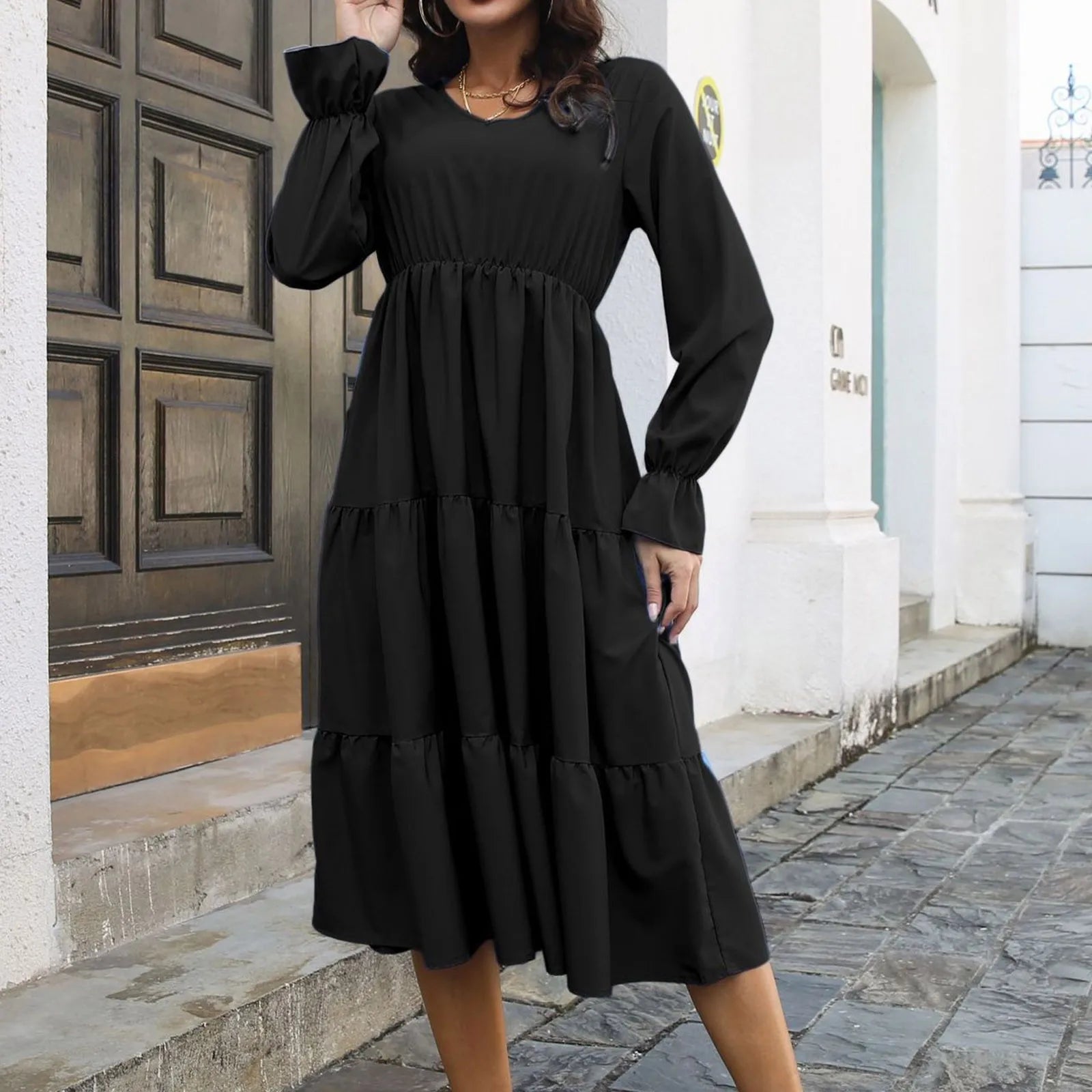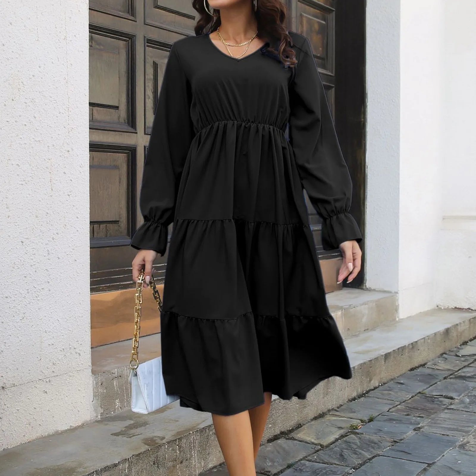JuliaFashion - Chiffon V-Neck Women Long Sleeve A-Line High Waist Beach Holiday Layered Swing Flare Sleeves Spring Autumn Dress