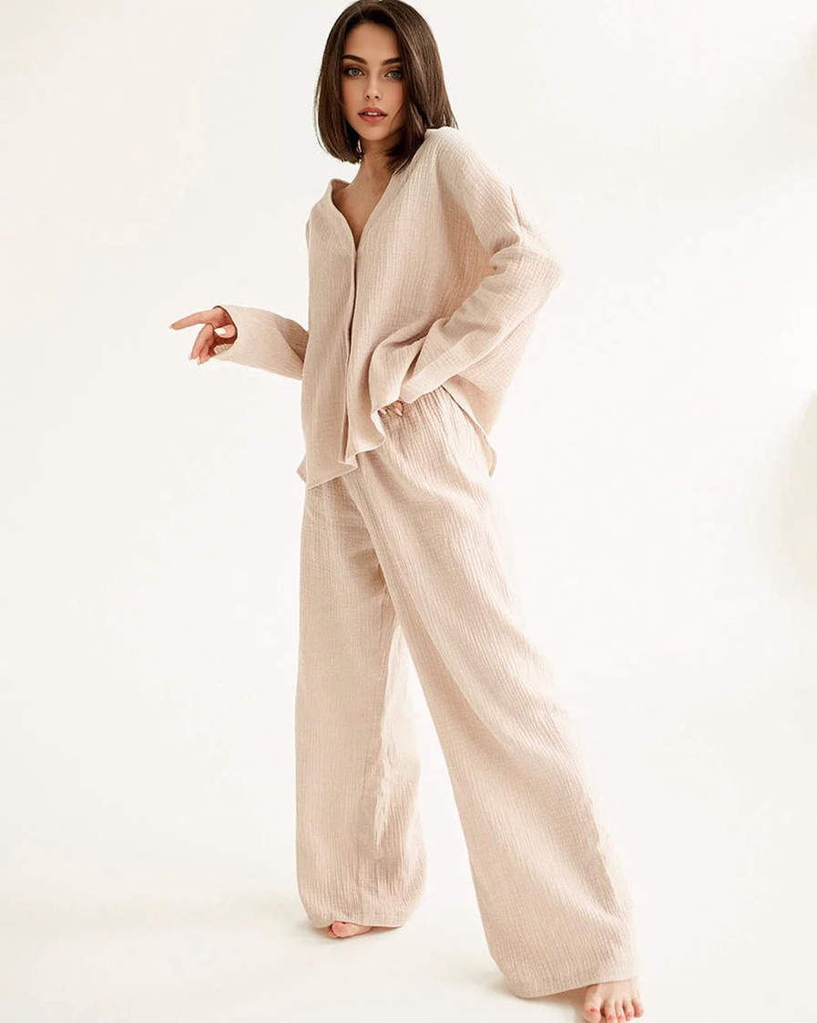 JuliaFashion-Cotton Linen Solid Single Breasted Long Sleeve Pijama Suit