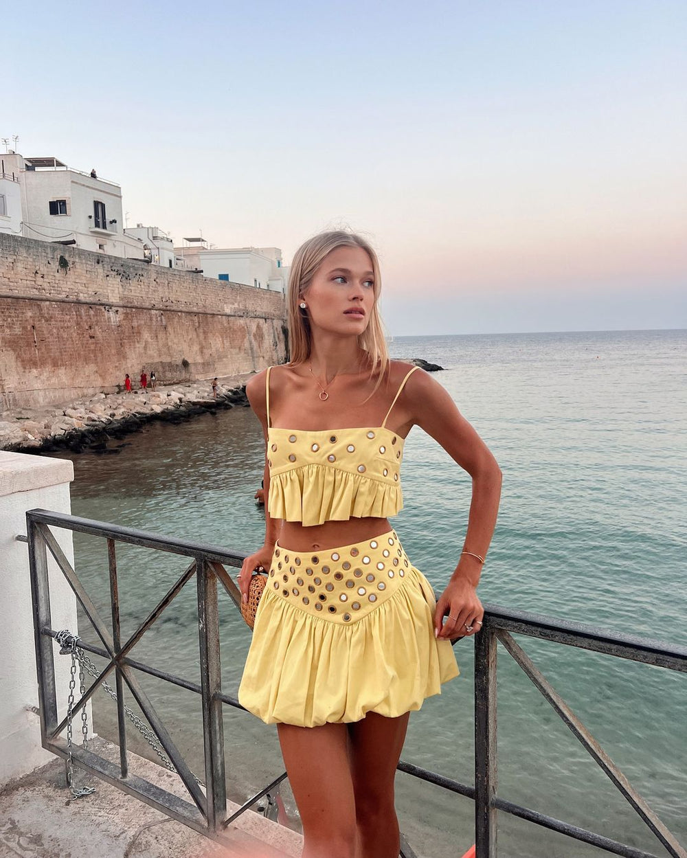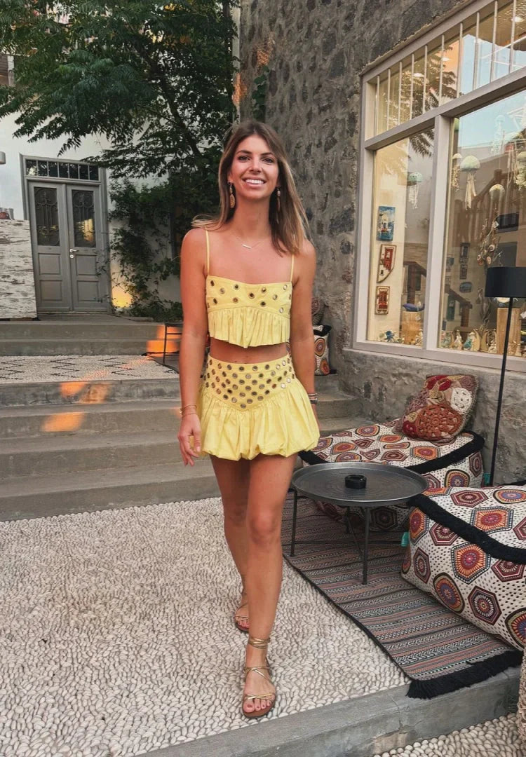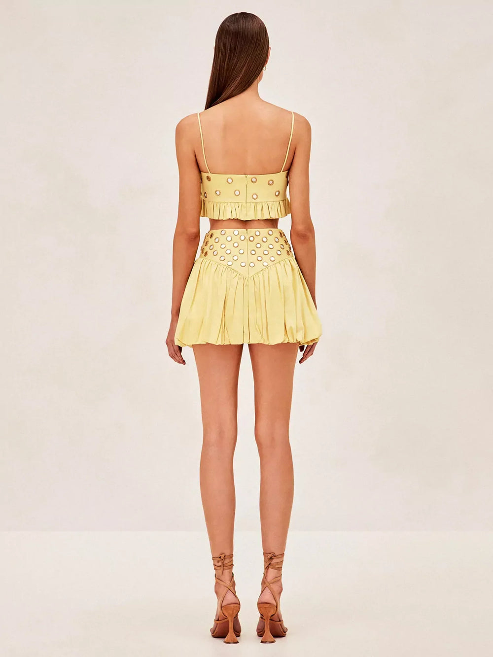 Infuse your wardrobe with playful elegance through the Luminous Allure Mirror Skirt Set. This charming ensemble features a skirt embellished with shimmering mirror appliqués, designed to catch the light and captivate attention. The high-waisted design and fluid ruched details enhance its sophisticated appeal. Paired perfectly with the matching top, this set creates a cohesive and eye-catching outfit that exudes charm and style.