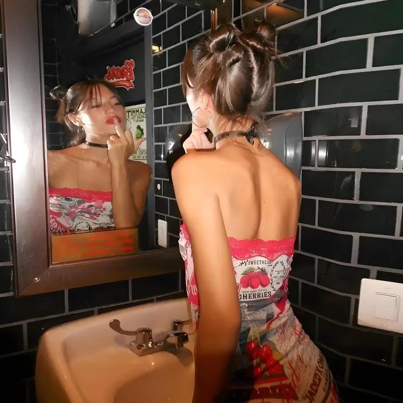 Turn heads with this Y2K-inspired mini dress featuring a bold cherry print and edgy side slits. Perfect for a night out, it combines retro vibes with a modern twist, making a striking fashion statement.