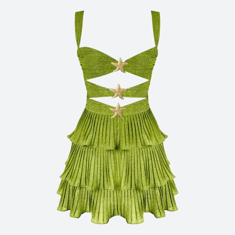 Shine like you're born to be seen. This glitter mini dress features gold starfish cut-out connectors, a fitted bust, and a tiered ruffle skirt. Beach party? Yacht invite? This mermaidcore moment was made to sparkle under sunlight and strobe lights alike.