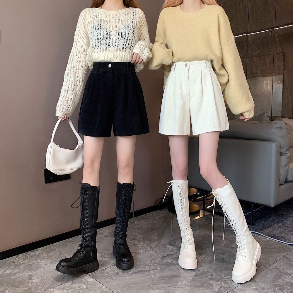 A perfect blend of dark academia aesthetic and comfort, these high-waisted corduroy shorts in brown, white, or black are a wardrobe essential. They feature a zip and button fastening, an elasticated back waist for a snug fit, and two classic pockets.