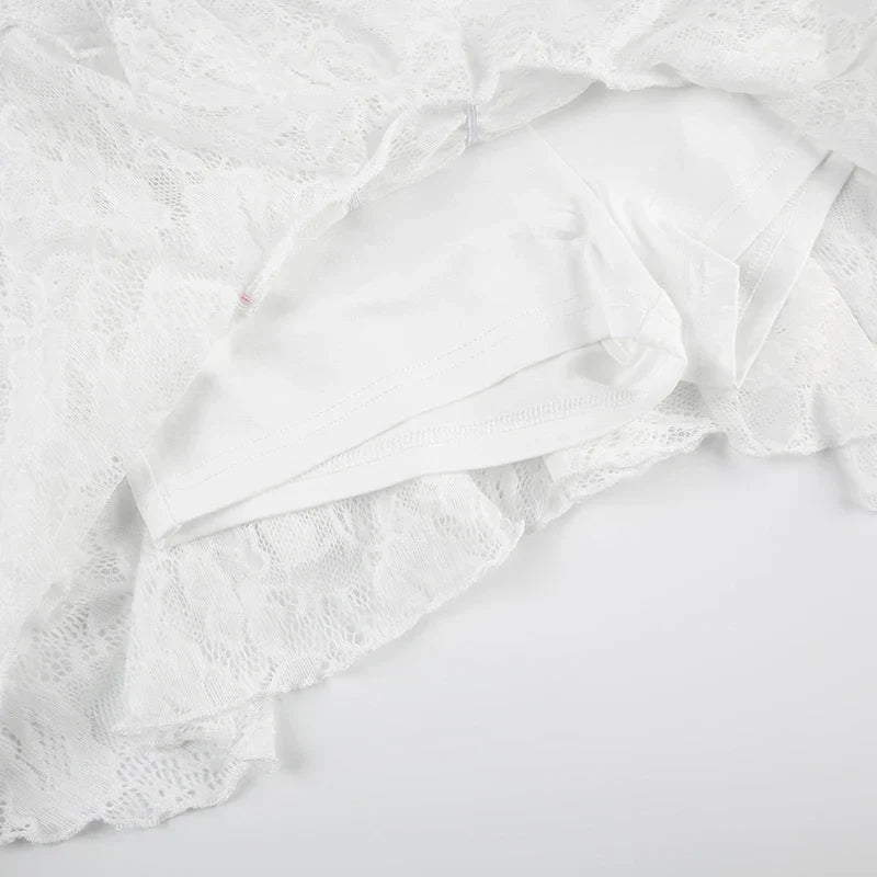 Give your outfit a dreamy twist with this Fairycore lace mini skirt. The asymmetrical hem and ruched waist keep the silhouette playful. Great for festivals or date nights.