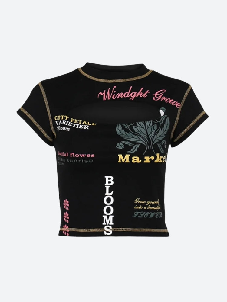 Turn heads in this bold baby tee designed with street edge and playful cutouts. Featuring a graphic "Market Blooms" print and a flattering cropped fit, it’s your go-to for nights out or festival looks.