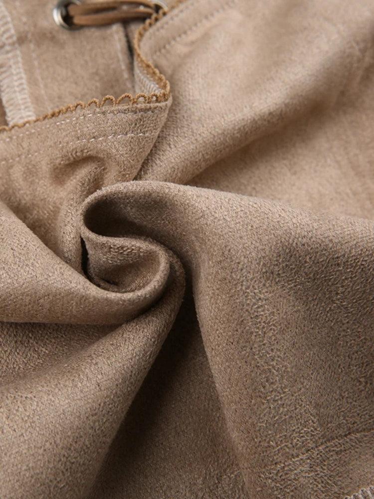 Vintage western meets modern boho in this lace up top. With its scalloped lace collar, faux suede texture, and pointed hem, it’s a statement piece for free-spirited wardrobes. The adjustable front tie lets you style it snug or slouchy—ideal for summer festivals, rooftop hangs, or desert road trips.