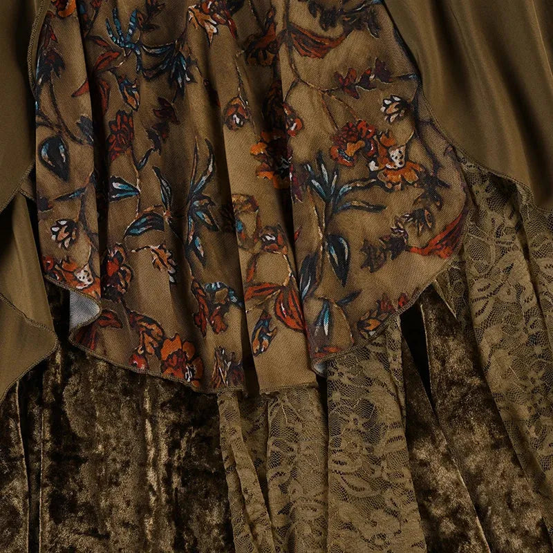 Let your inner woodland muse shine. This fairycore layered midi skirt blends sheer lace, draped florals, and asymmetric ruffles for an ethereal, romantic feel. Earthy tones and mixed textures channel vintage fantasy vibes with modern edge. Wear it barefoot in a meadow or styled with boots for a boho night out.