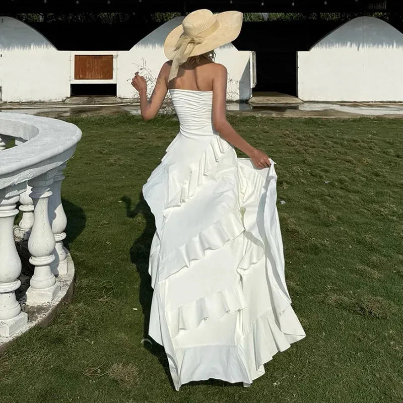 Whimsical, flirty, and floaty—this strapless white dress channels fairycore energy with cascading ruffles and a dramatic high-low hem. Perfect for barefoot garden strolls or dreamy summer dates, it's all about soft silhouettes with a bold twist.