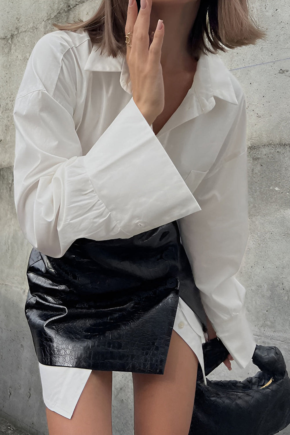 Solid Button Shirt And Faux Leather Skirt Set