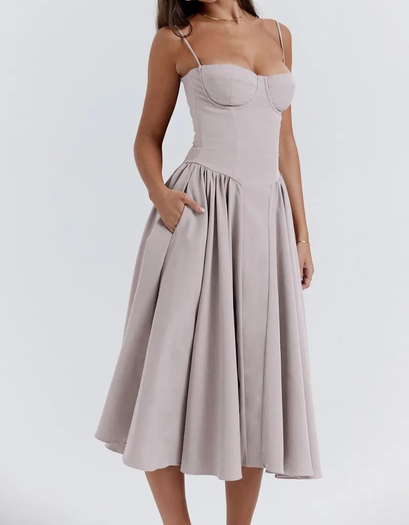 Introducing the Carolyn Sleeveless Corset Midi Dress where contemporary glamour meets a touch of allure. This stunning midi dress features a chic sleeveless design and a flattering corset bodice. perfect for any elegant occasion. Crafted from high-quality. structured fabric. the Carolyn dress ensures you feel confident and stylish whether attending a cocktail party or a sophisticated dinner. Elevate your wardrobe with this versatile piece that effortlessly blends modern style with classic sophistication.
