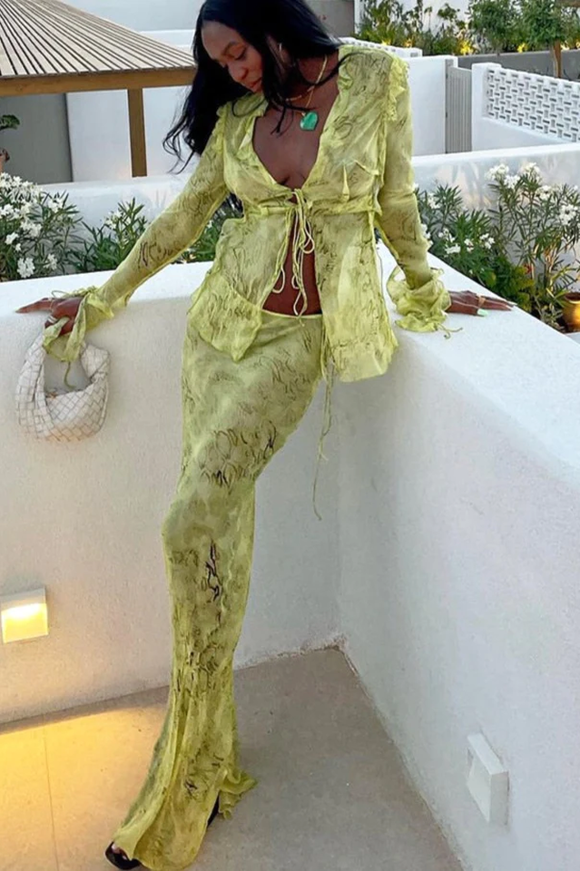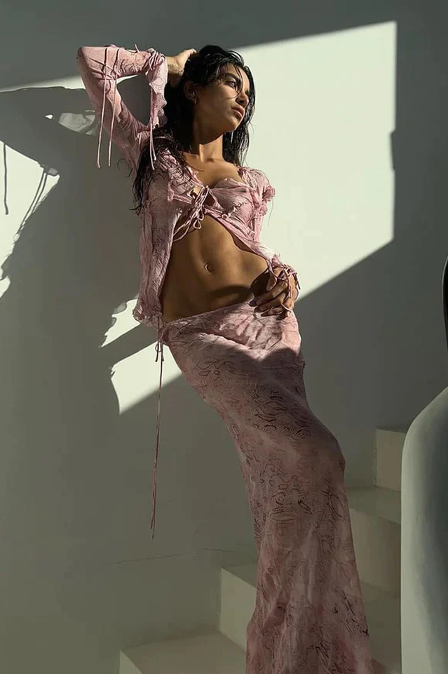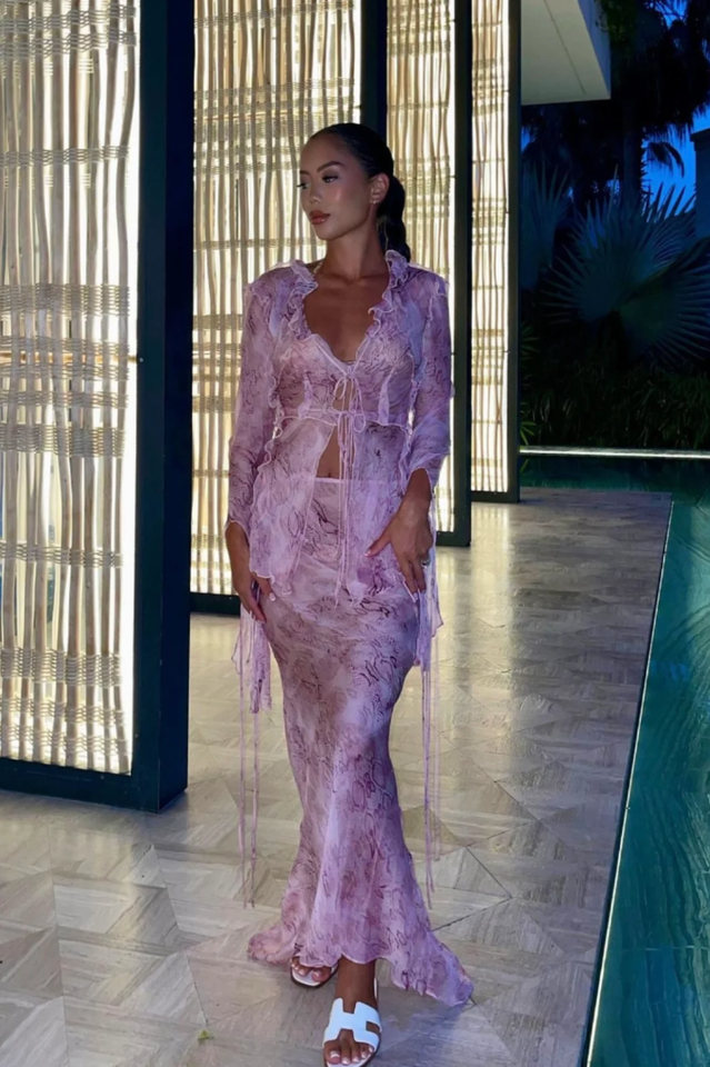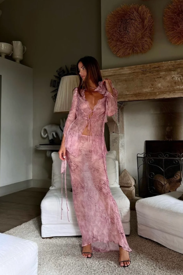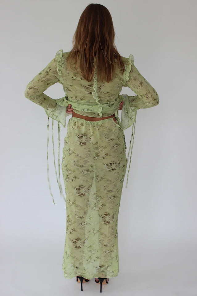 Lightweight frilled hem maxi skirt with adjustable hip tie closure. Made of mesh fabric.