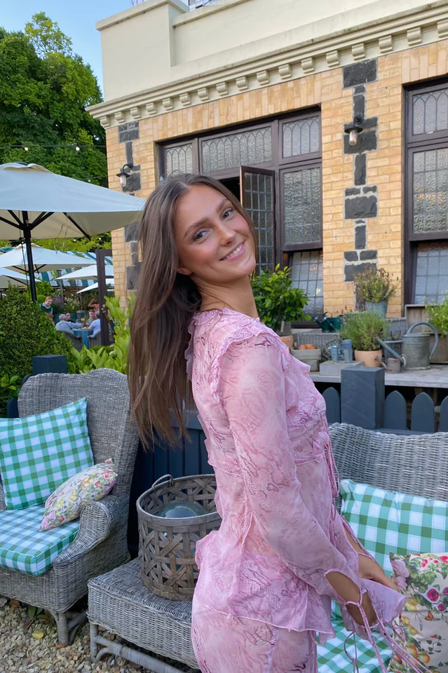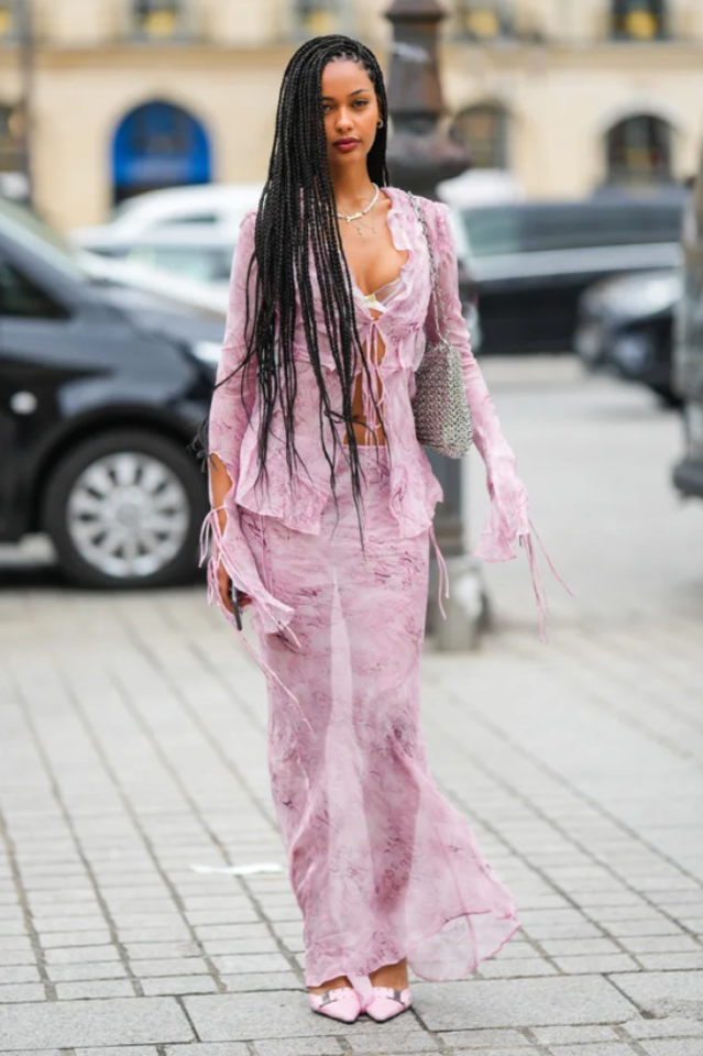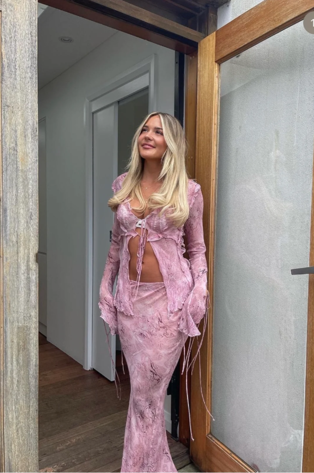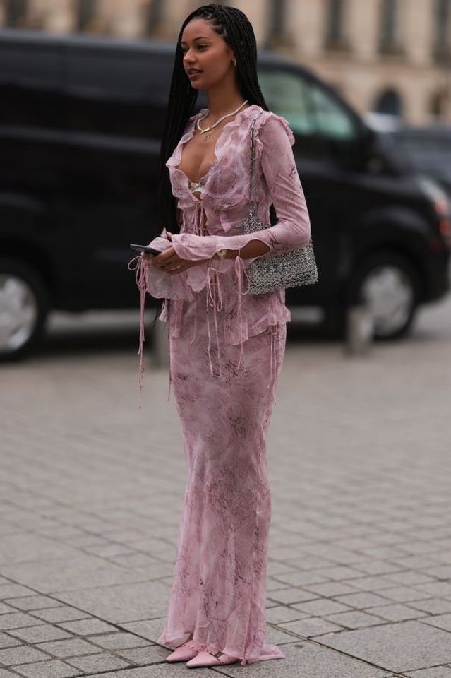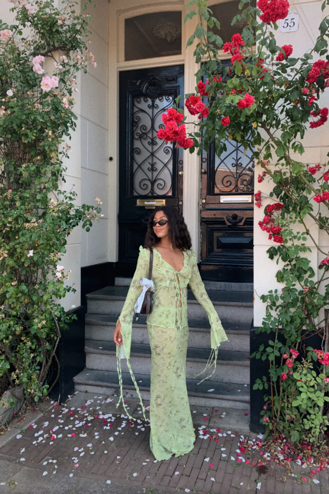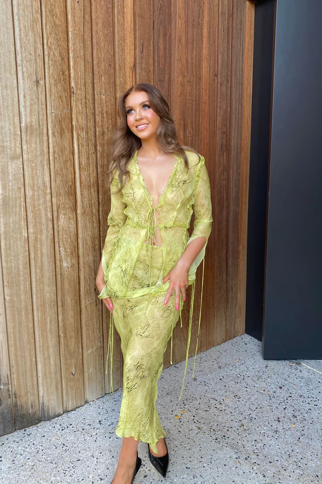 Lightweight frilled hem maxi skirt with adjustable hip tie closure. Made of mesh fabric.