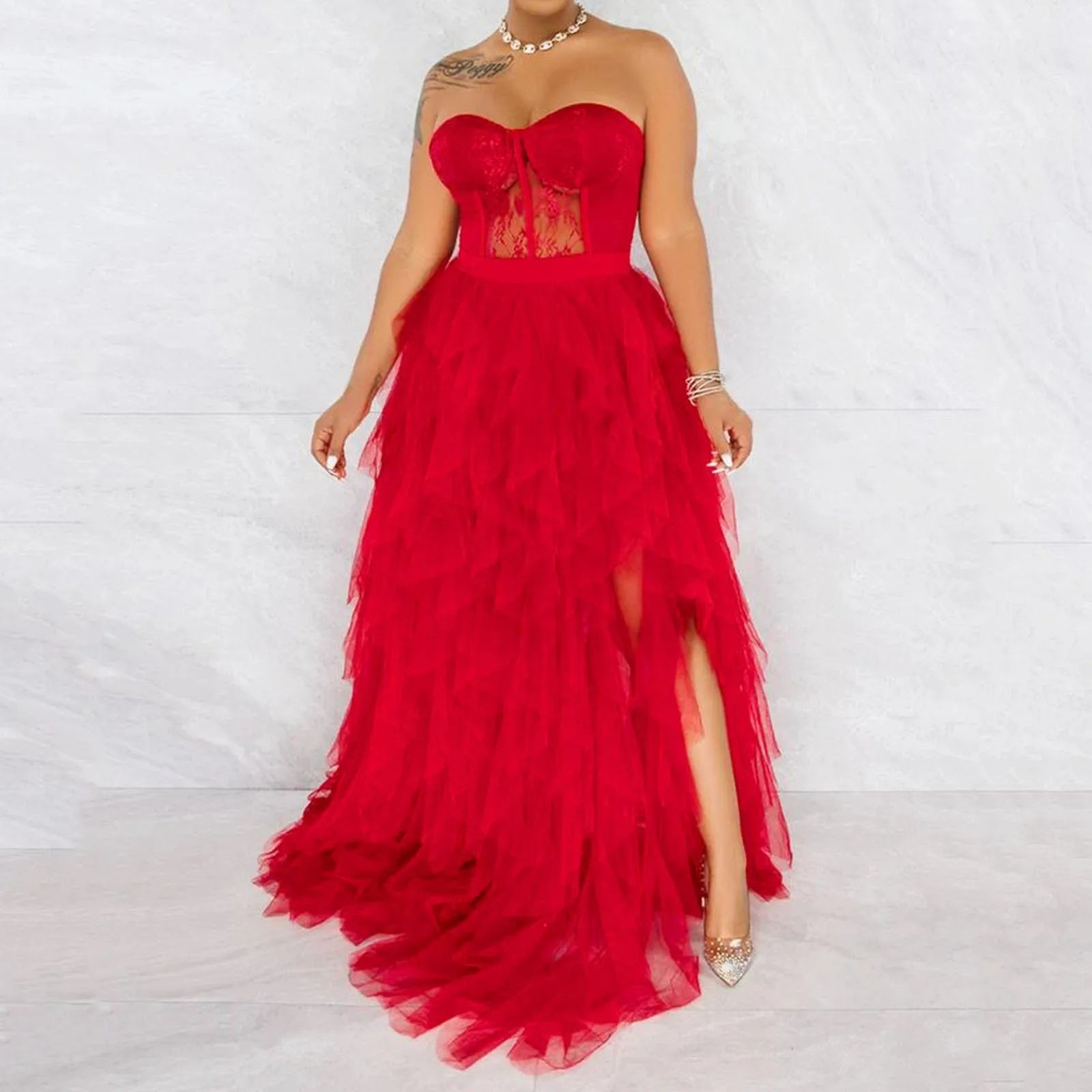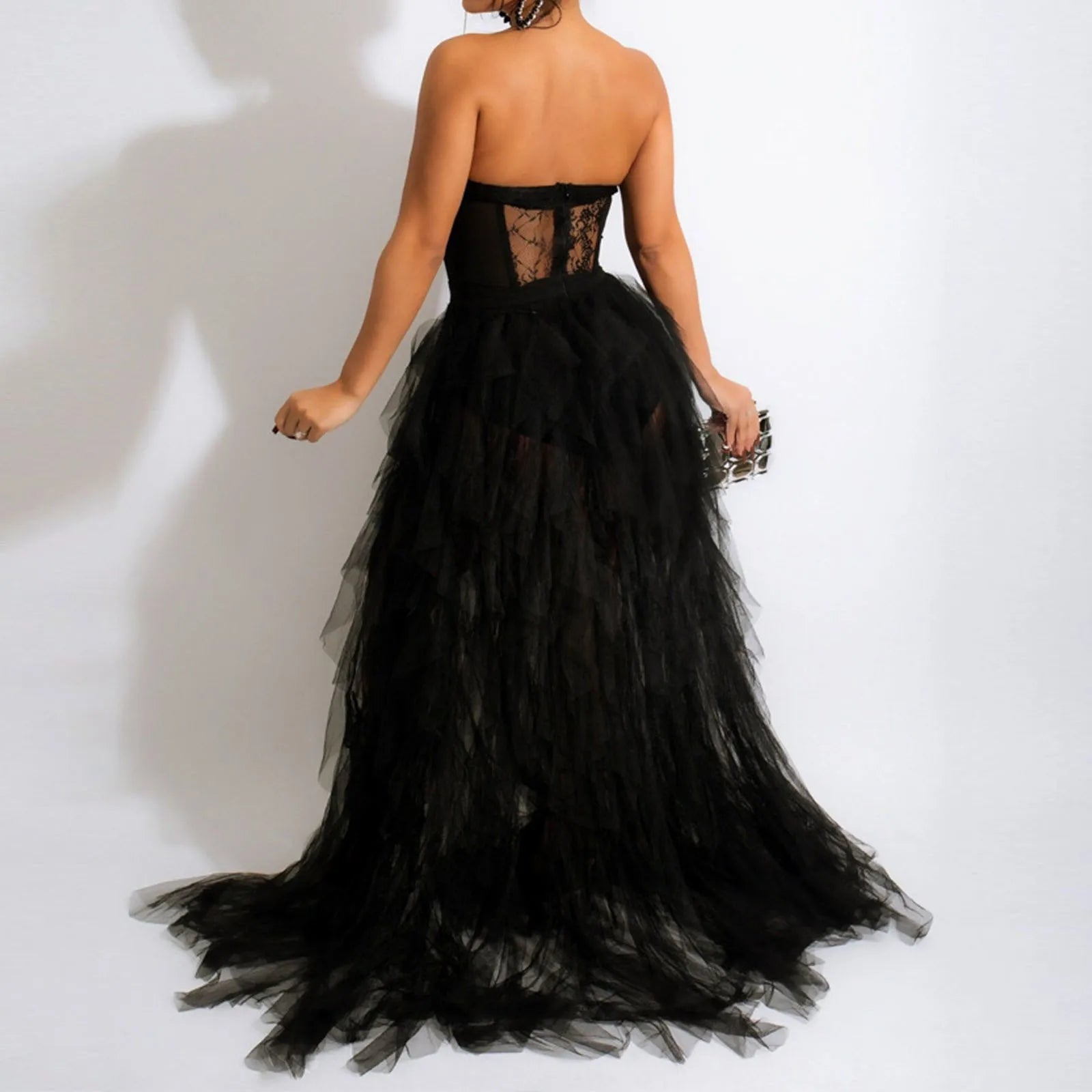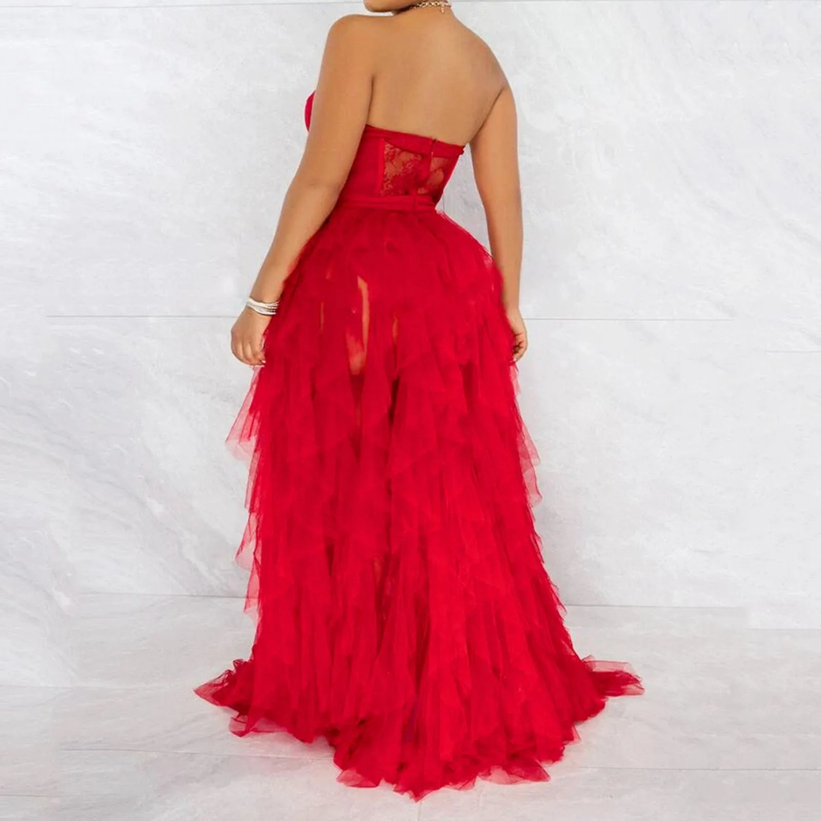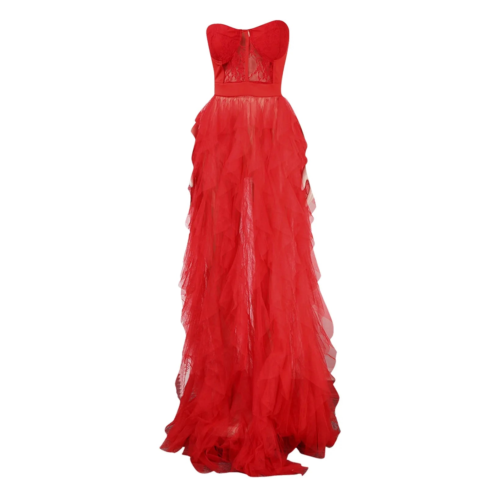 JuliaFashion - Elegant Party See Through Lace Mesh Corset Maxi Strapless Hollow Tulle Black Red Luxury Evening Gown Dress