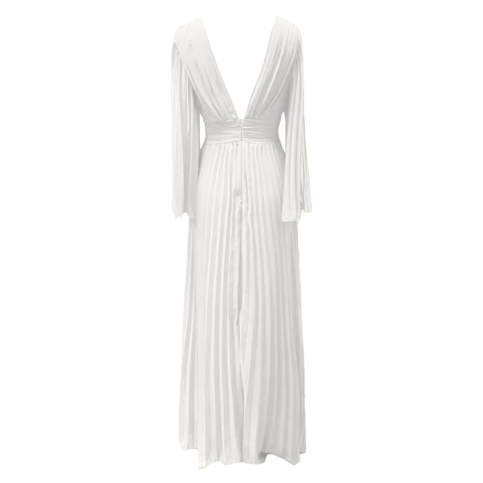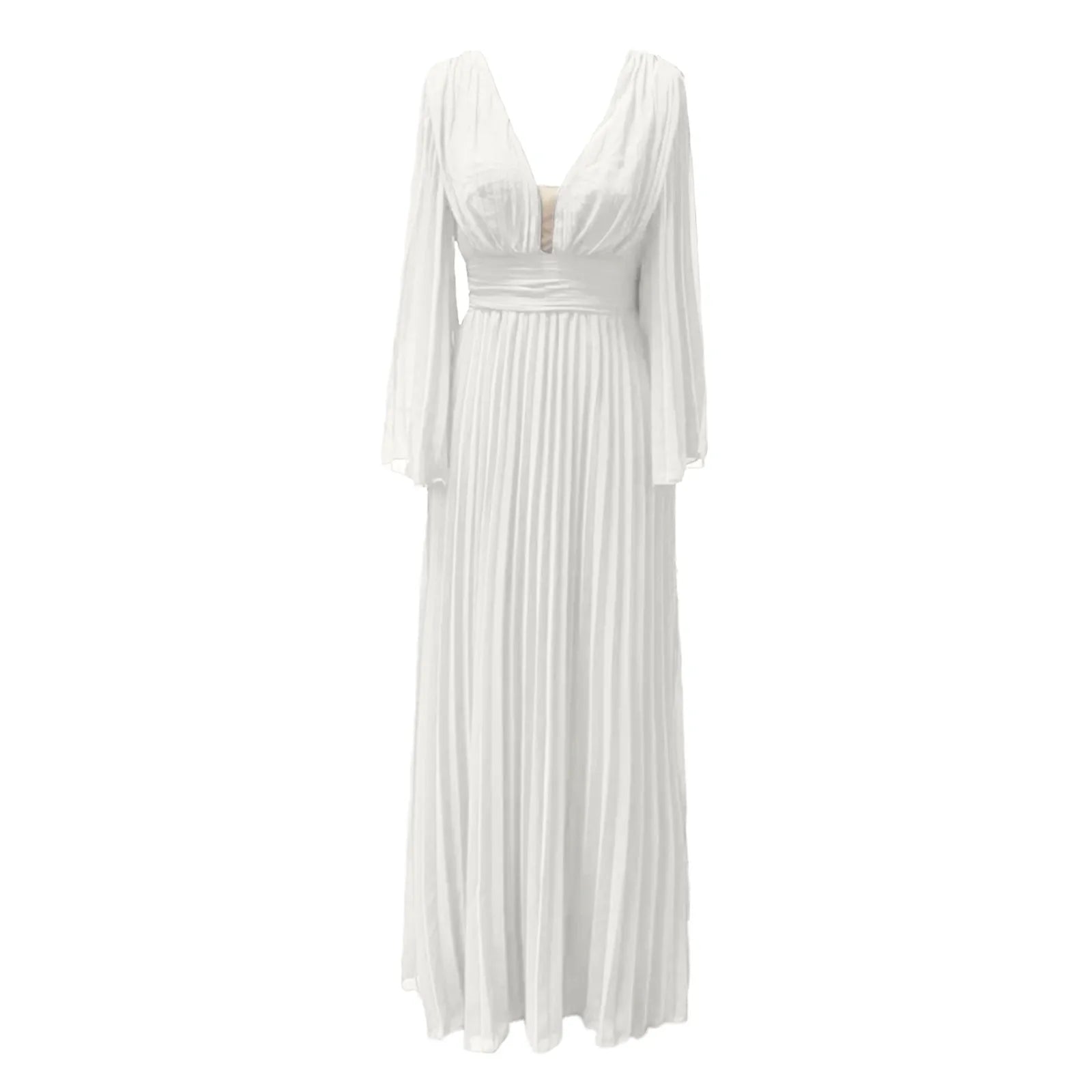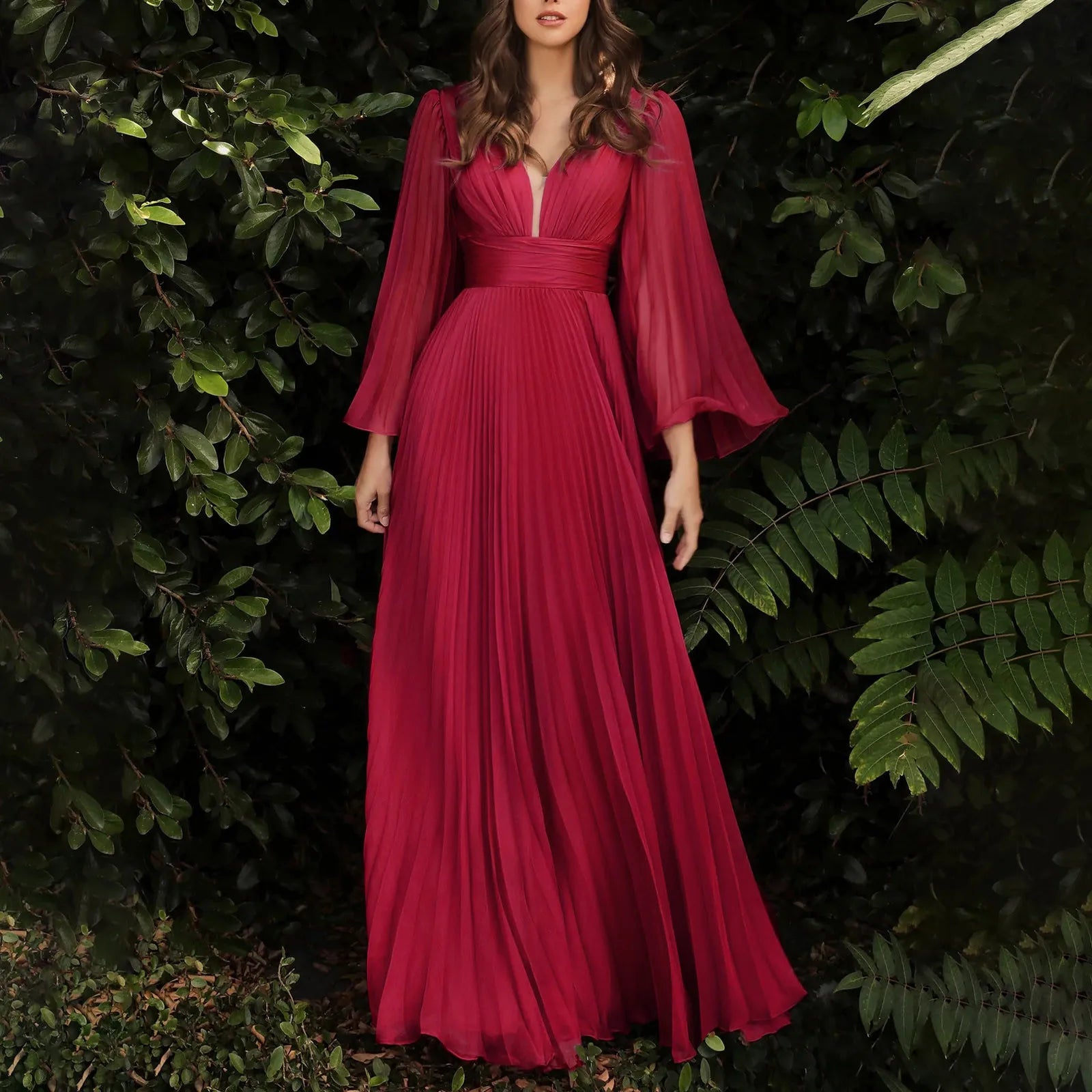 JuliaFashion - Elegant Solid Color Deep V Flare Long Sleeve Maxi Chic Evening Party Dress