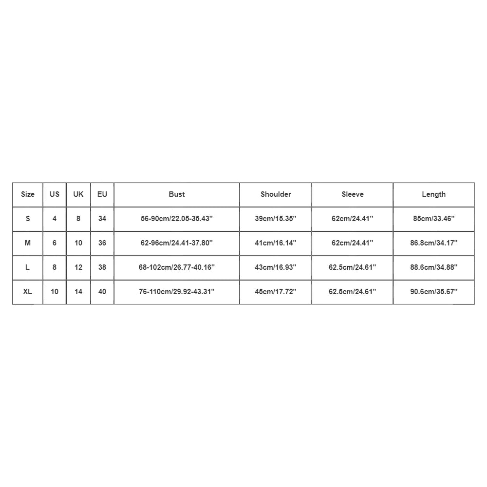 | Size | US | UK | EU | Bust | Shoulder | Sleeve | Length |