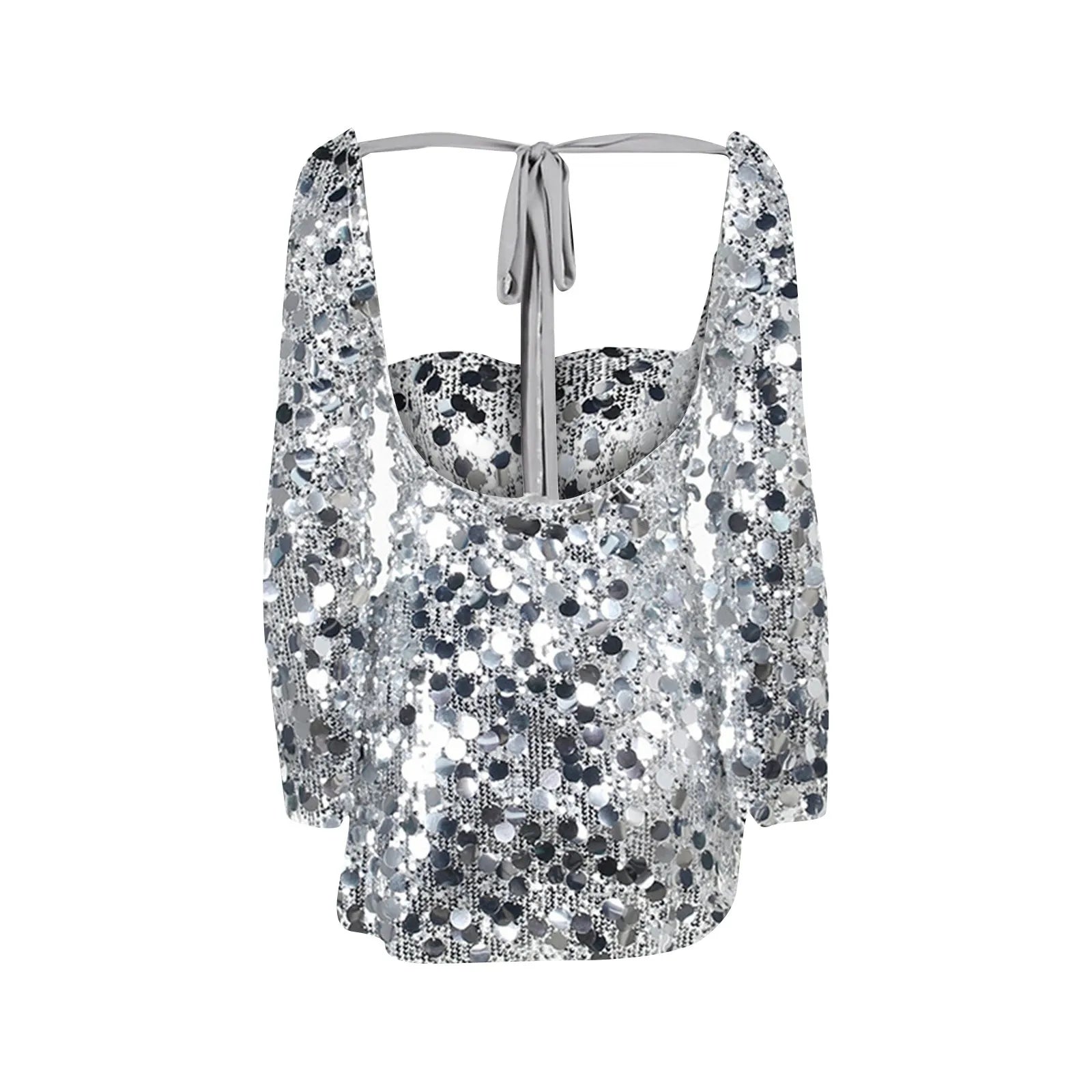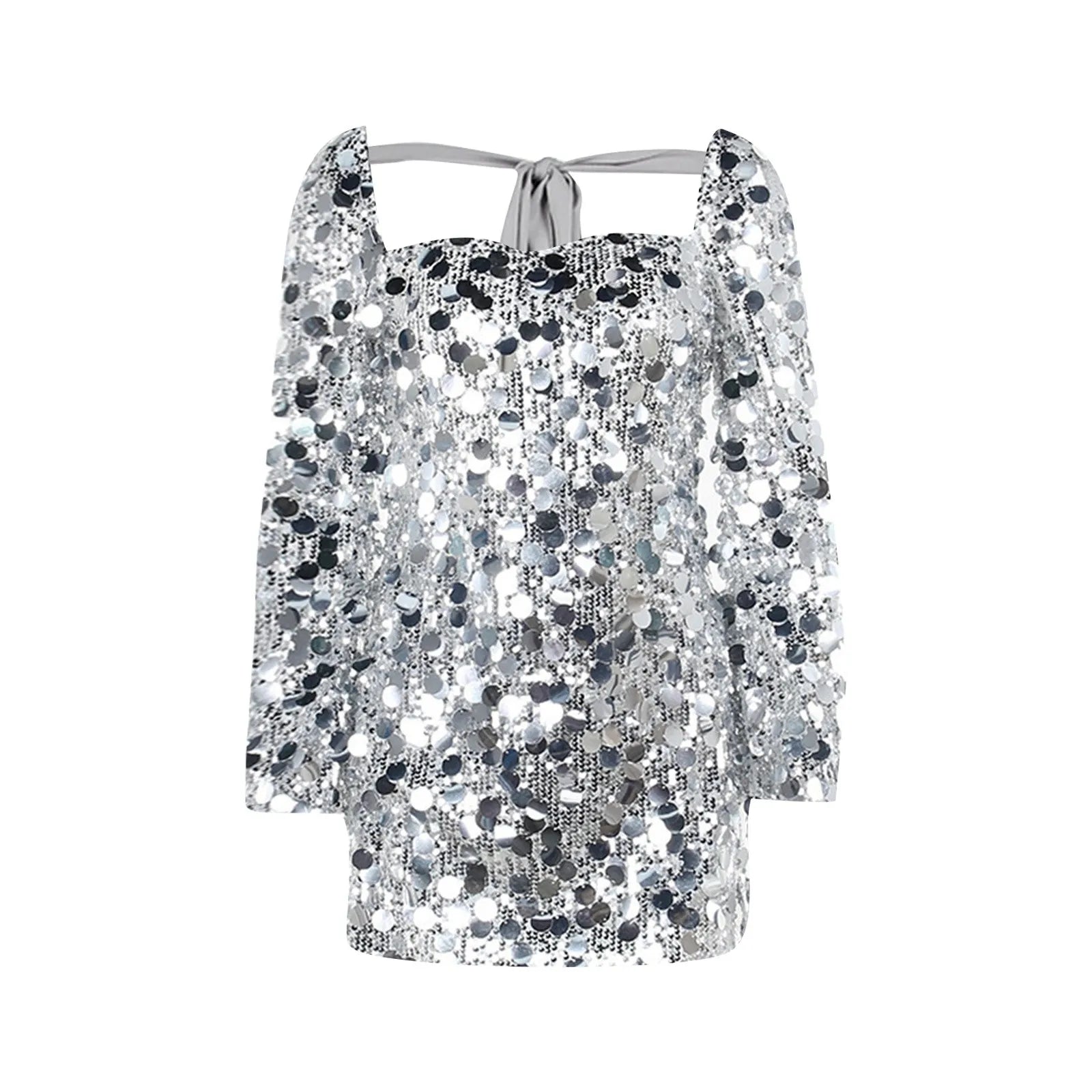JuliaFashion - Glitter Sequin Square Neck Long Sleeve Bodycon Club Party Vestidos Dress