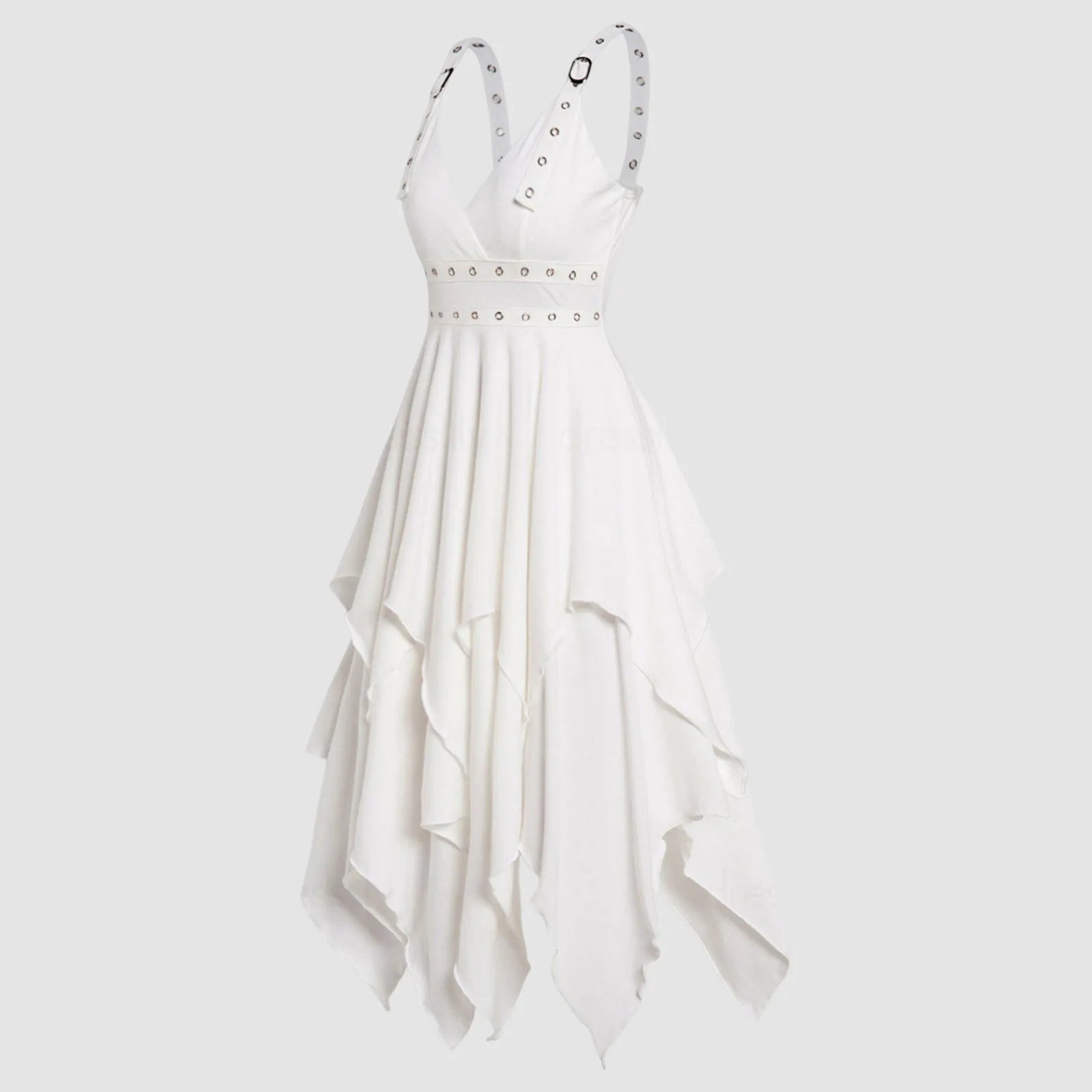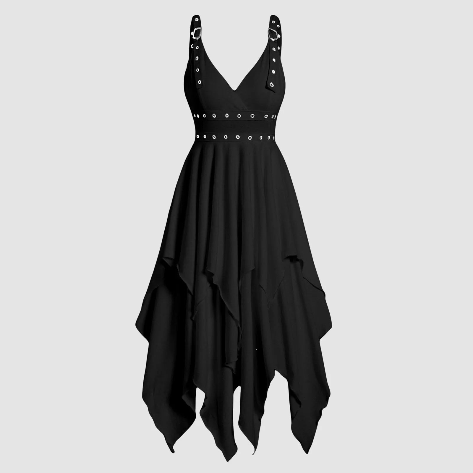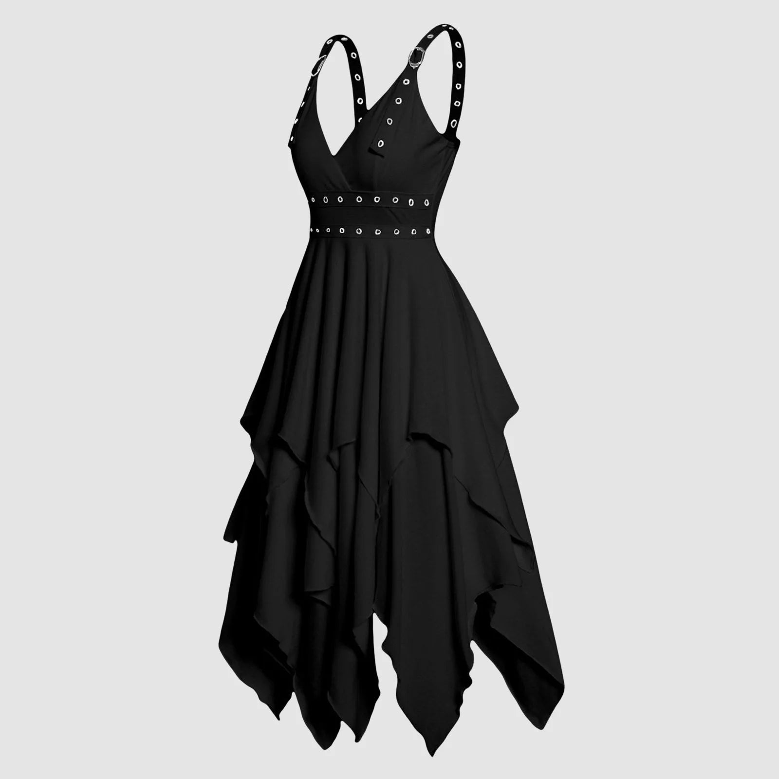 JuliaFashion - High Waist Asymmetrical Casual Midi Adjustable Strap Layered Sleeveless Solid Vintage Party Gothic Dress
