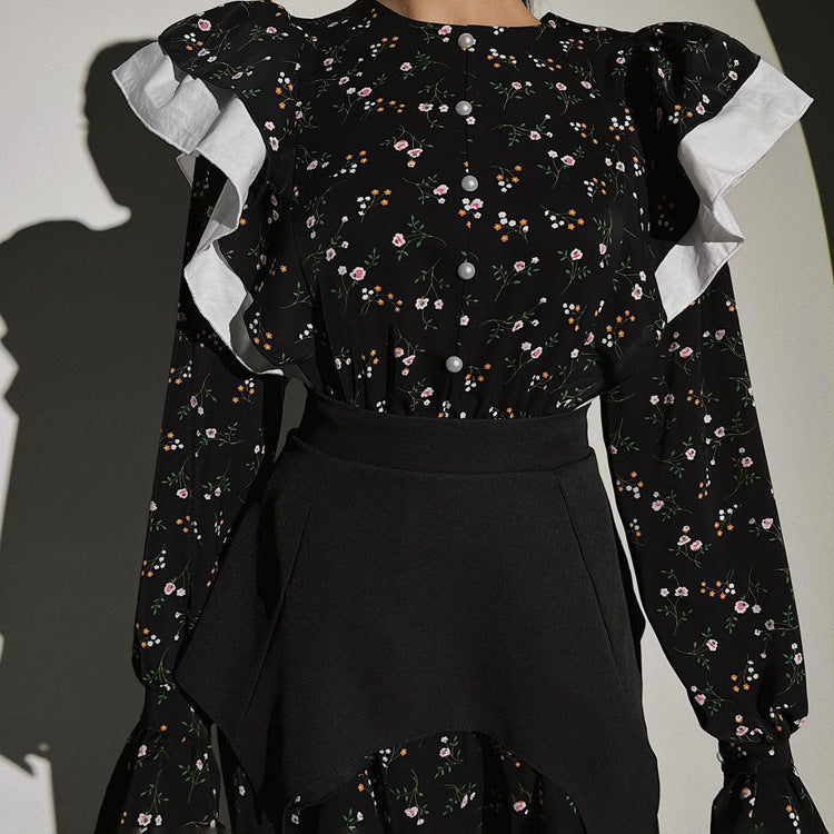 French Design Long Sleeve Dress Detachable Waist Seal Casual Floral Dress