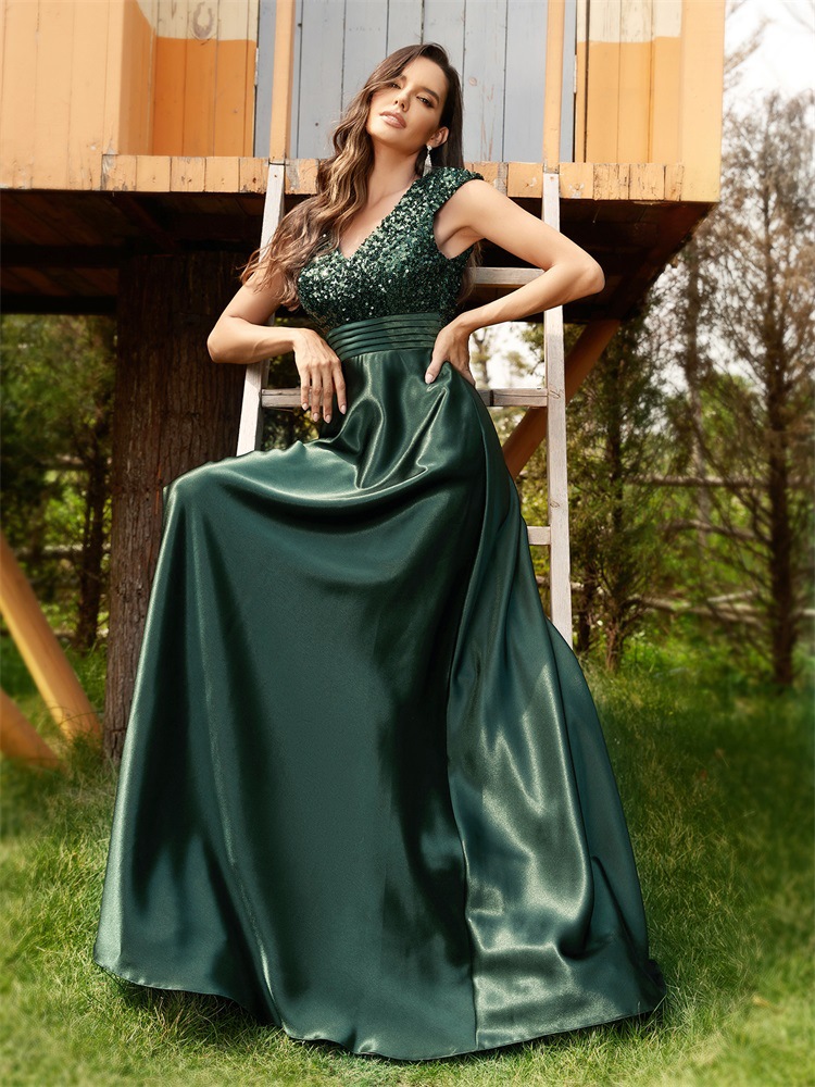 Sequined V neck Evening Dress for Cocktail Elegant Satin A line Dress Party