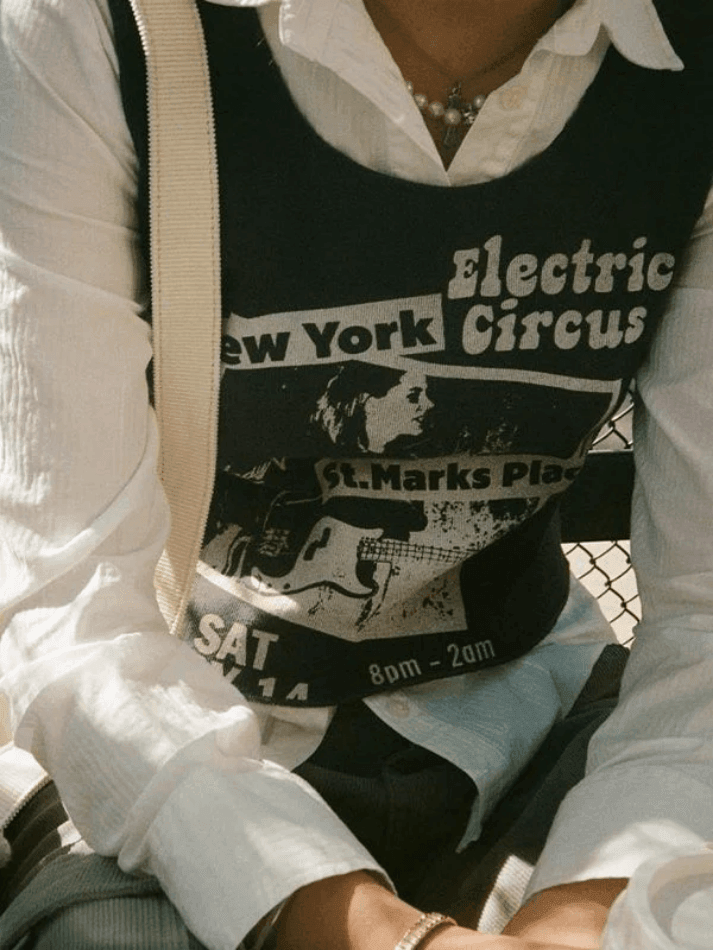 Description: Take this effortless. nostalgia tank top for chic street vibes. It's made from stretchy cotton blend fabric. features guitar girl pattern print on the front. and has cut off hem design. ended with overlocking seam detail.