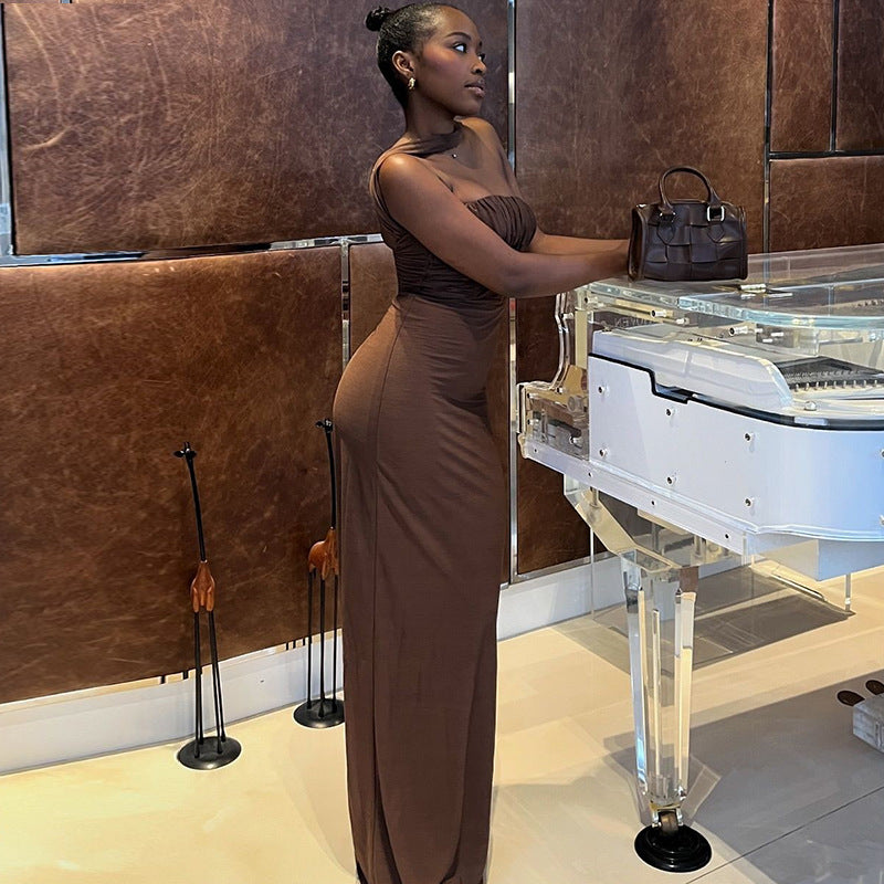 Solid Color Dress Tube Top Halter Cold Shoulder Sleeveless Maxi Dress