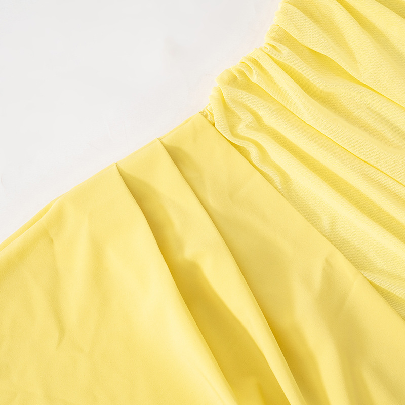 off Neck Mesh Stitching Waist Baring Slim Fit Pleated Hip Dress