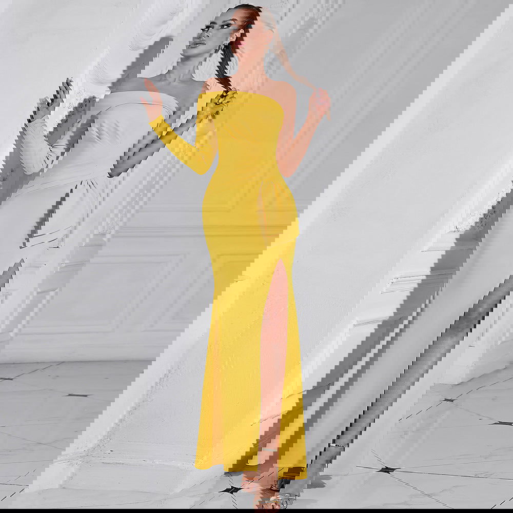Diagonal Collar One Shoulder Long Sleeve Elegant Hip Solid Color Split Dress