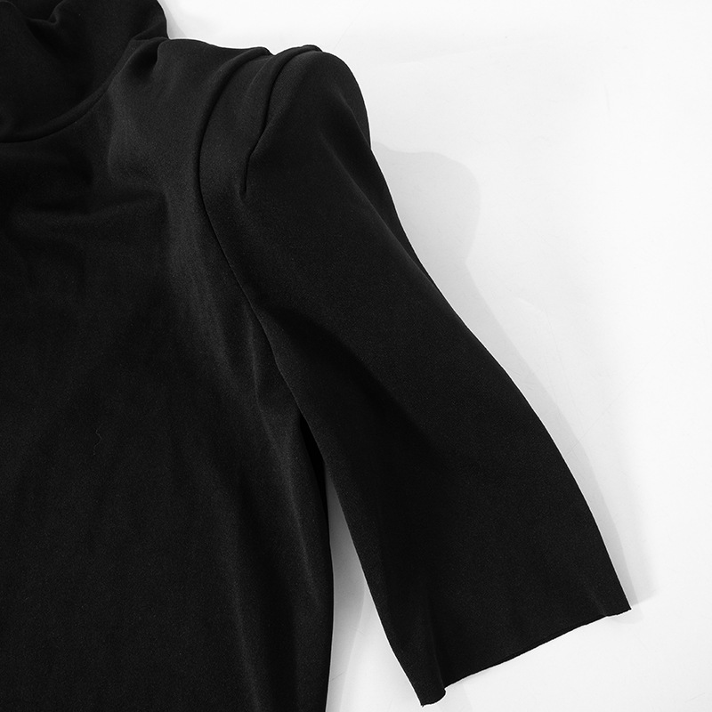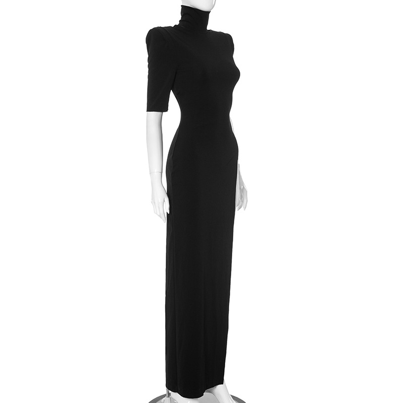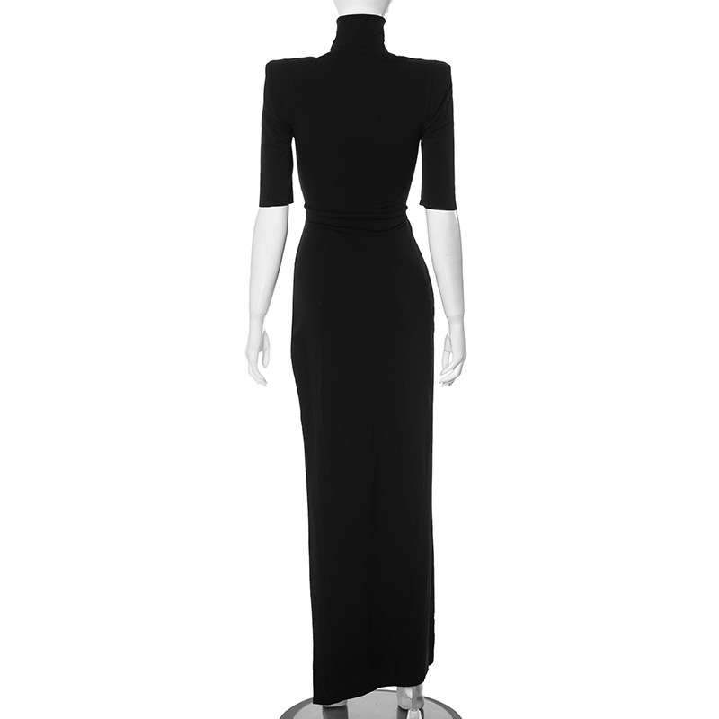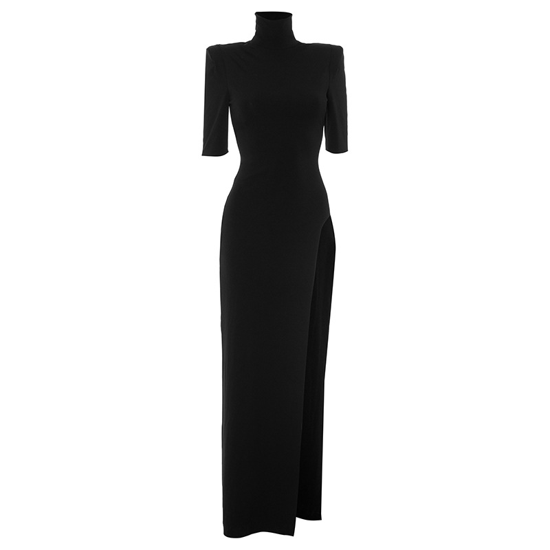 Solid Color Turtleneck Padded Shoulder High Waist Slim Fit Slit Long Dress