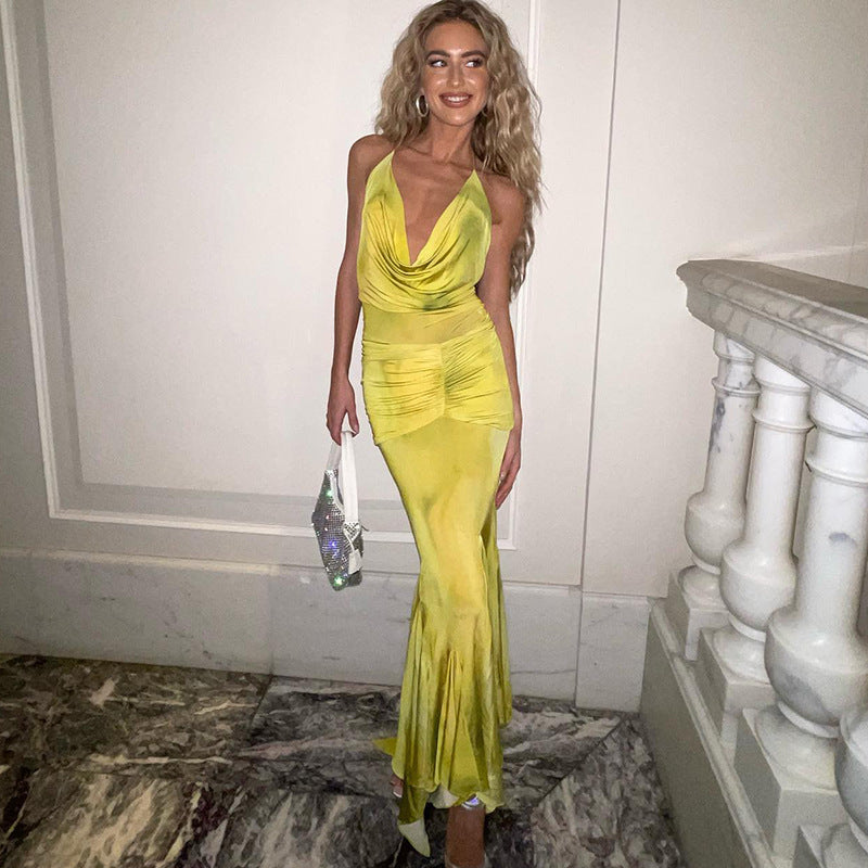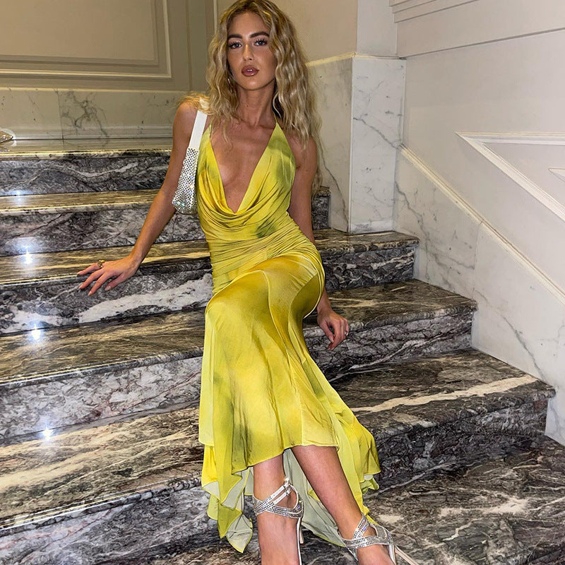 Elegant Slightly Mature Halter Deep V Plunge Printed Long Lotus Leaf Dress