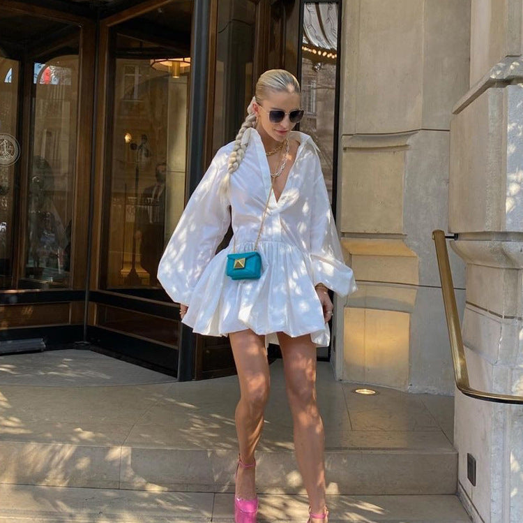 Solid Color Office Pleated Dress Collared Puff Sleeve Shirt Dress for