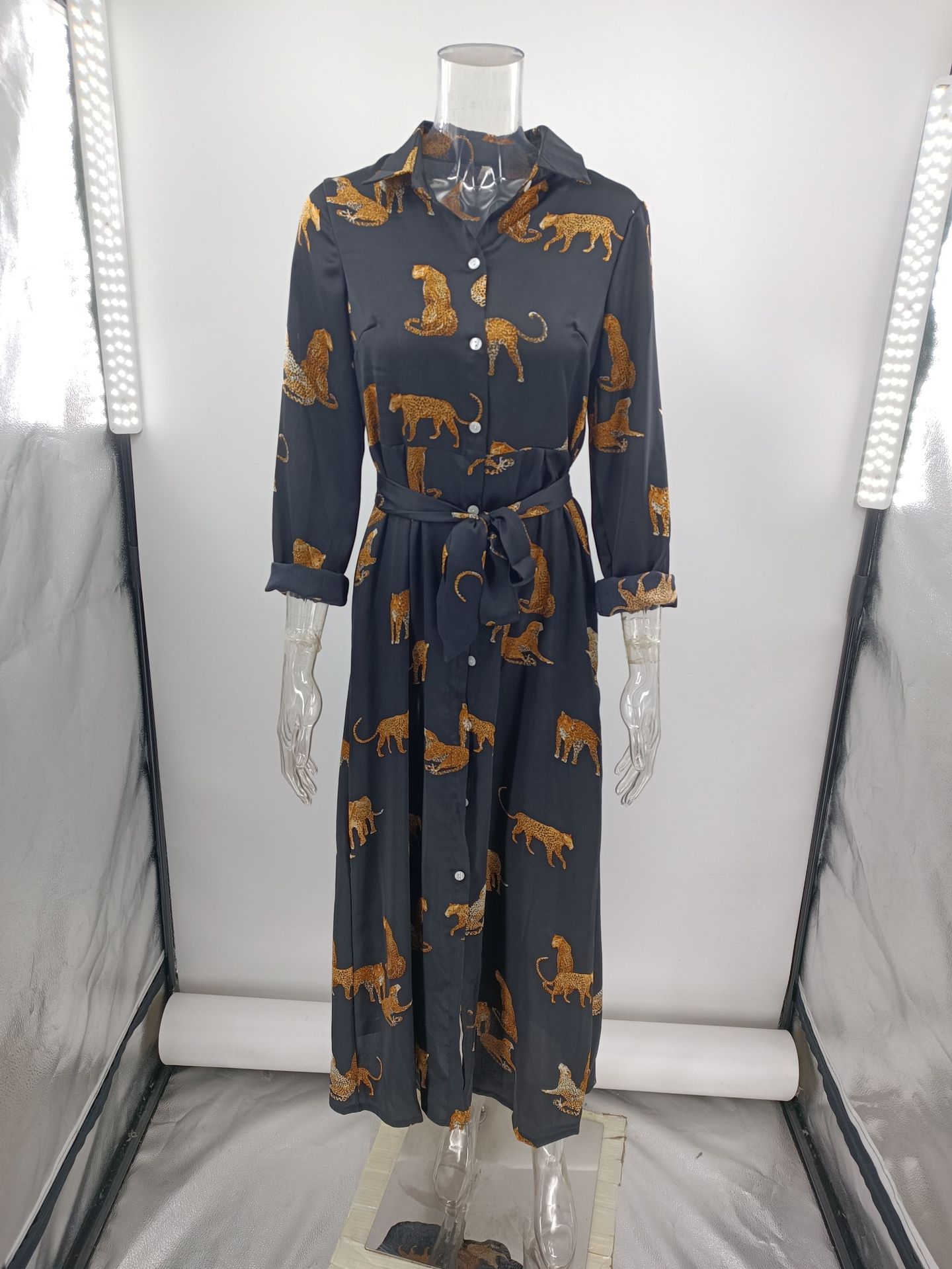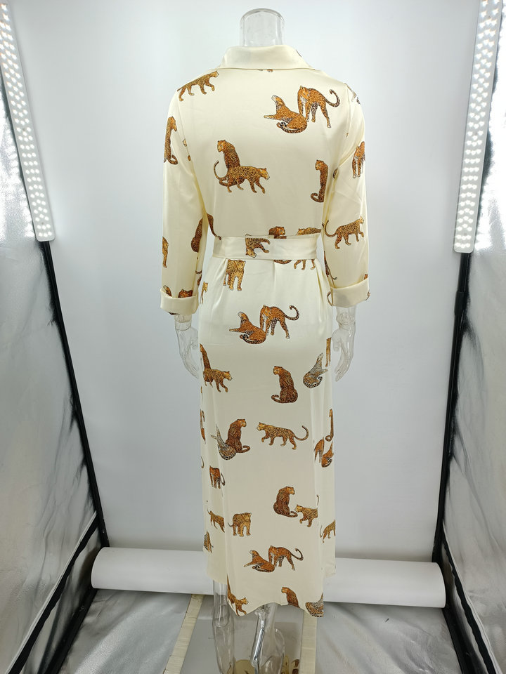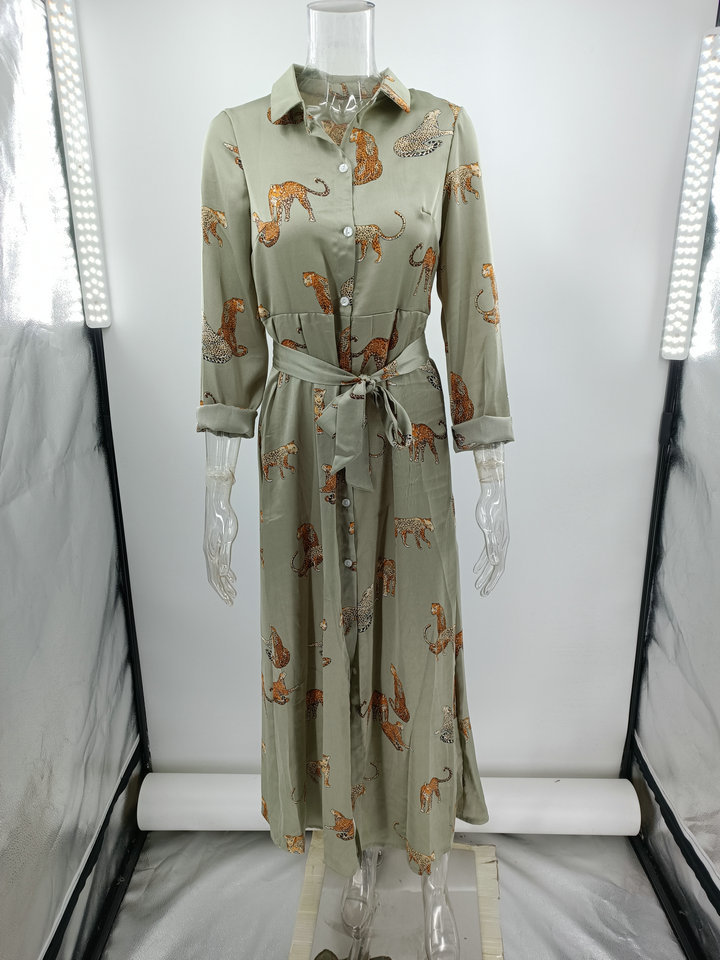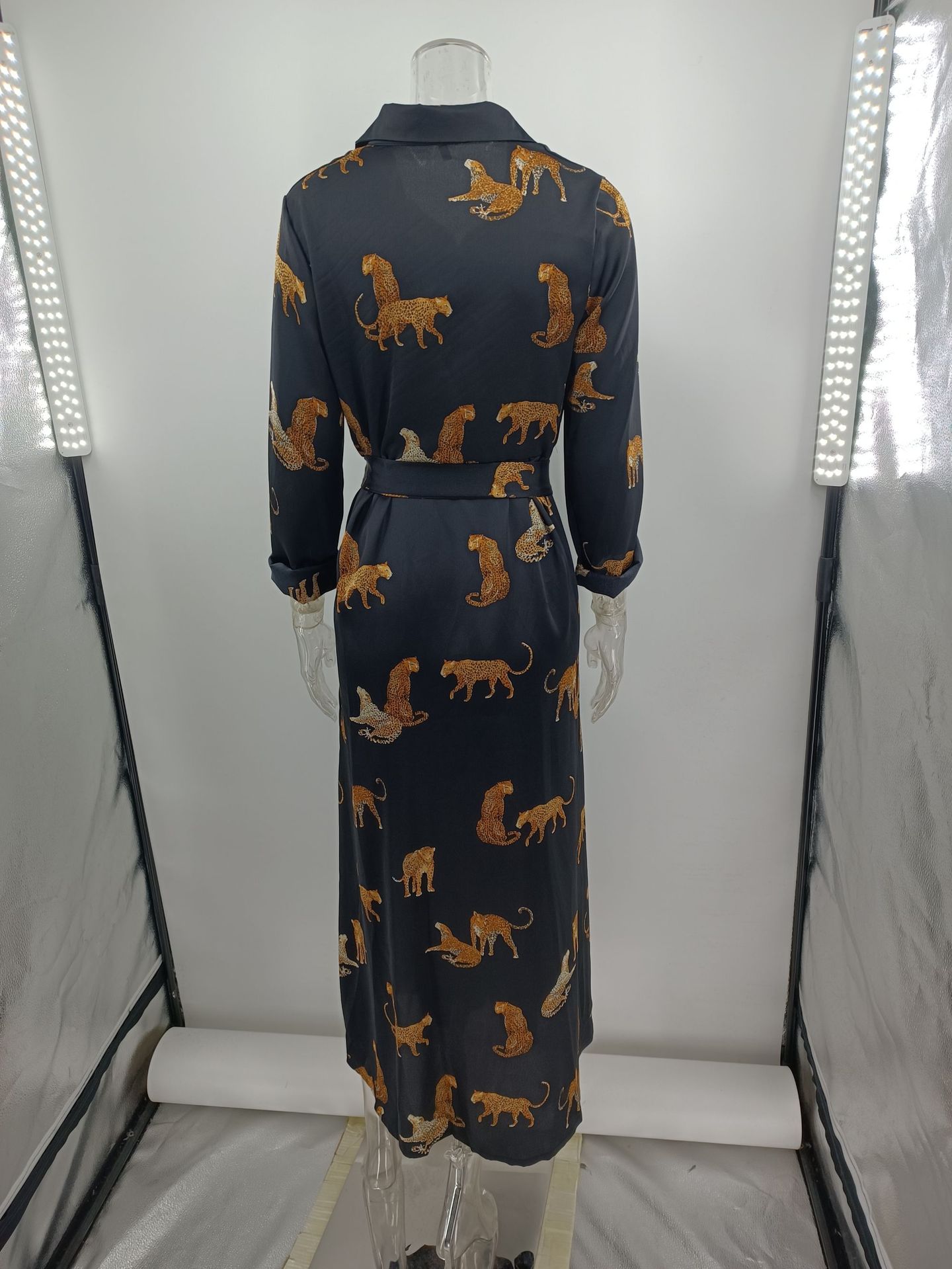 Fall Single Breasted Printed Leopard V Neck Long Sleeve Big Hem Dress
