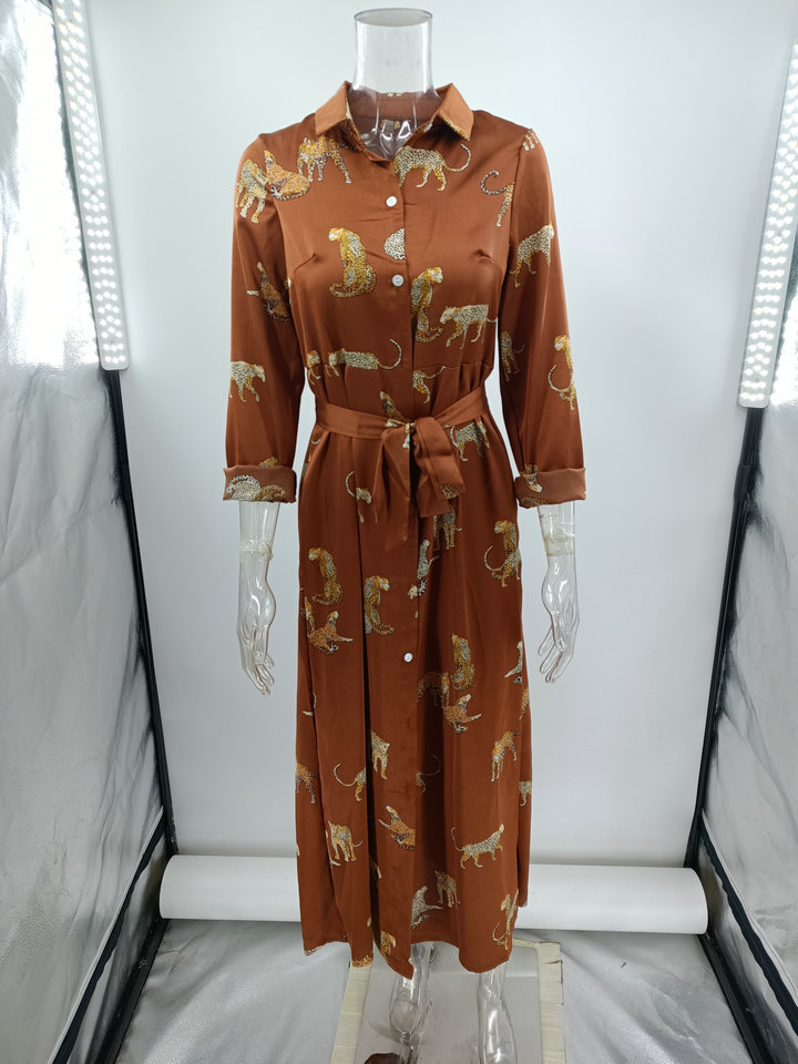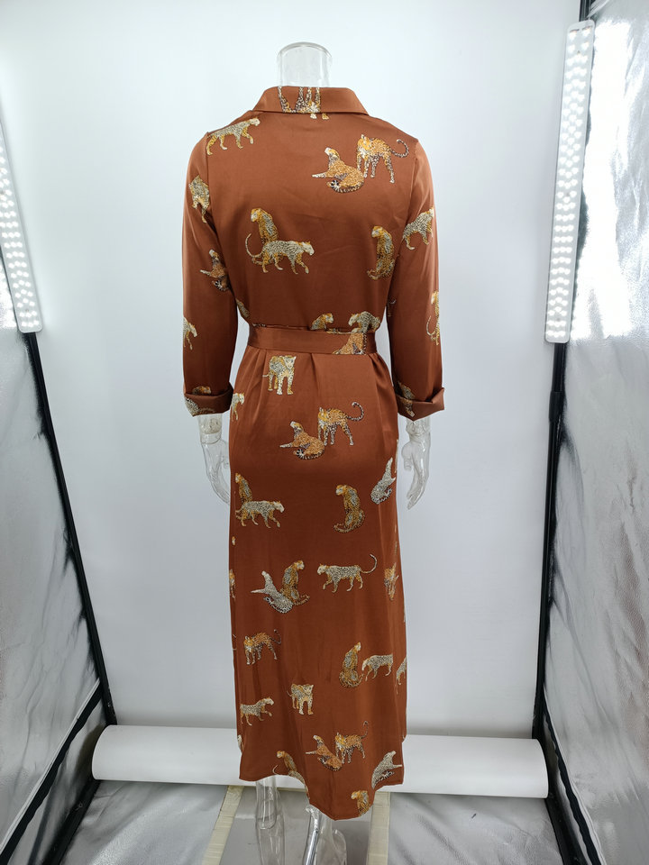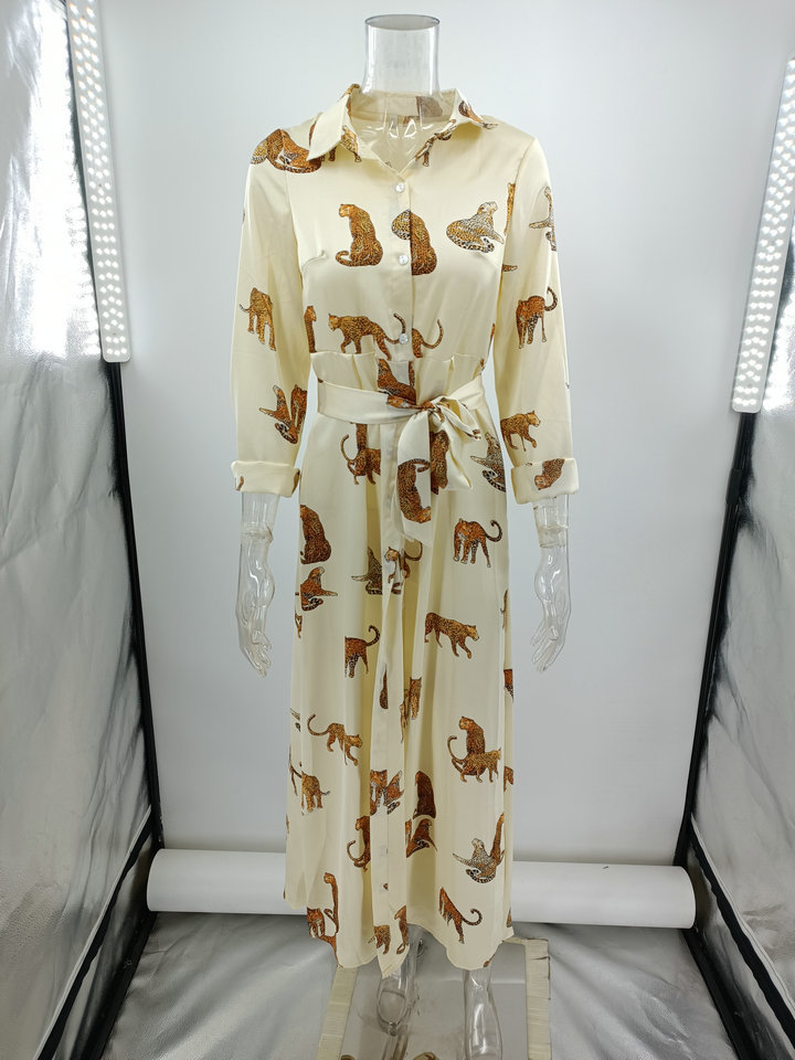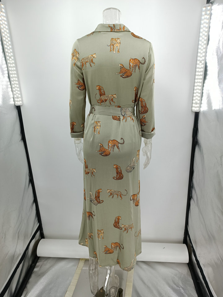 Fall Single Breasted Printed Leopard V Neck Long Sleeve Big Hem Dress