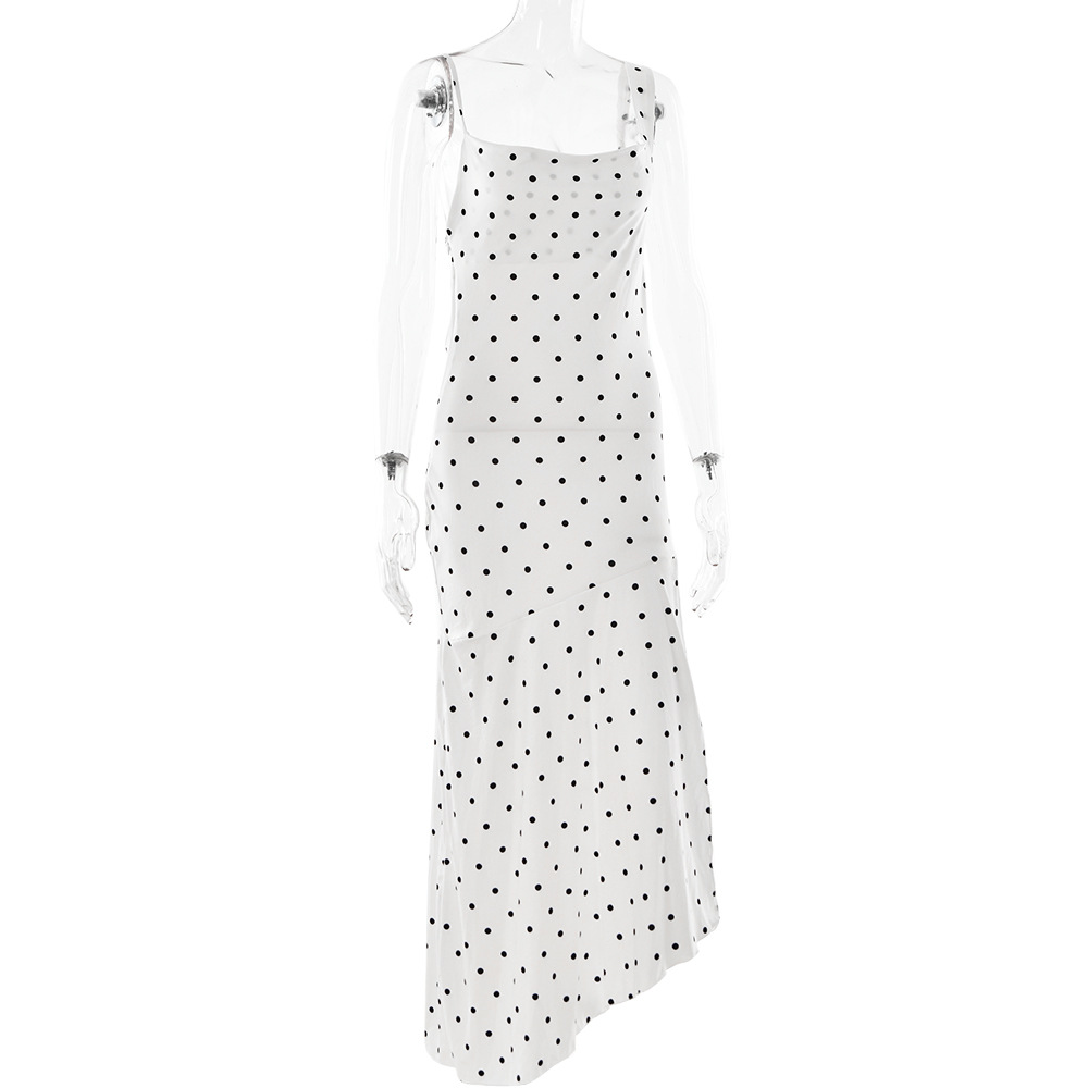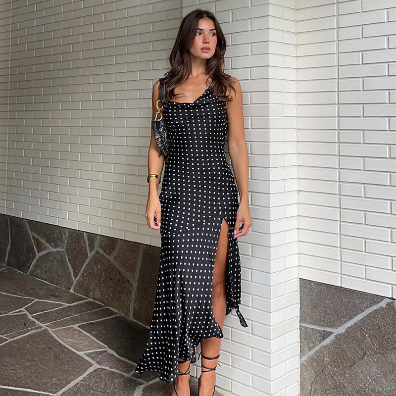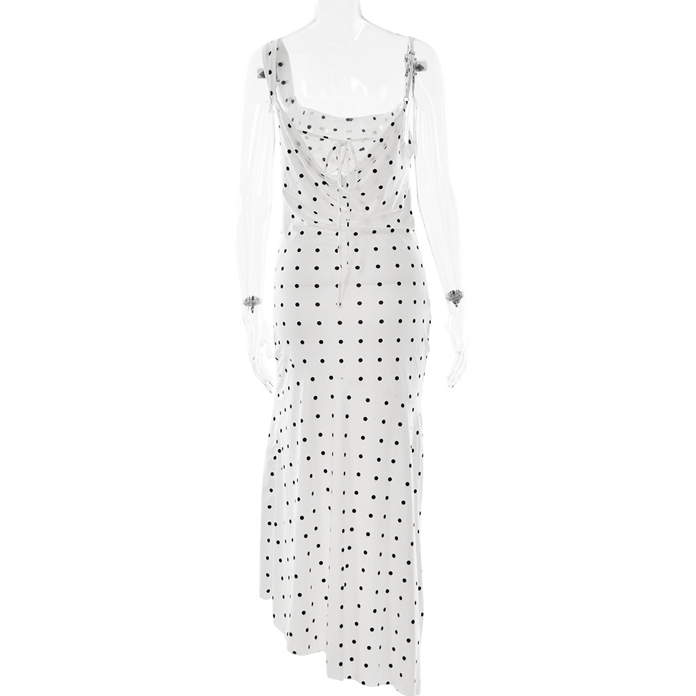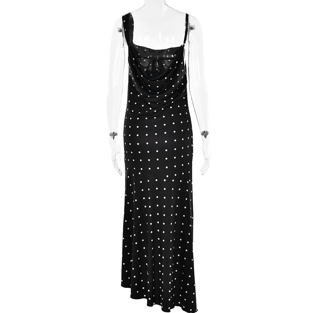 Polka Dot Brace Swing Collar Dress Sleeveless Backless Slit Maxi Dress