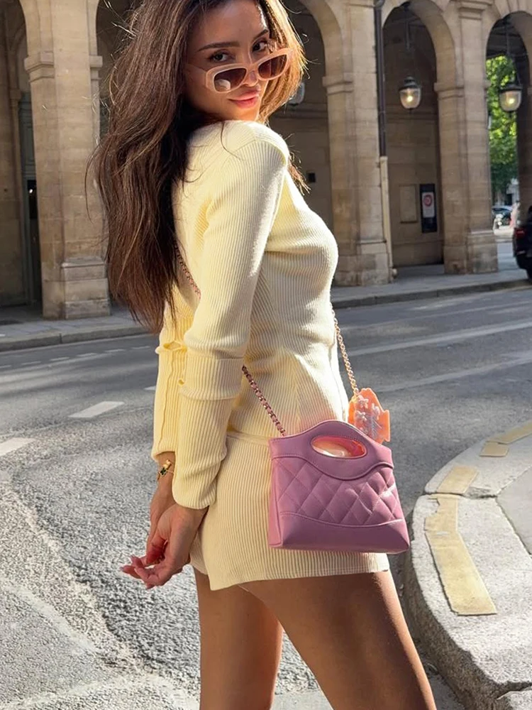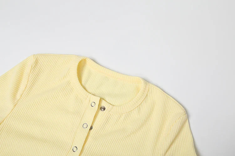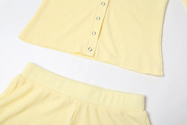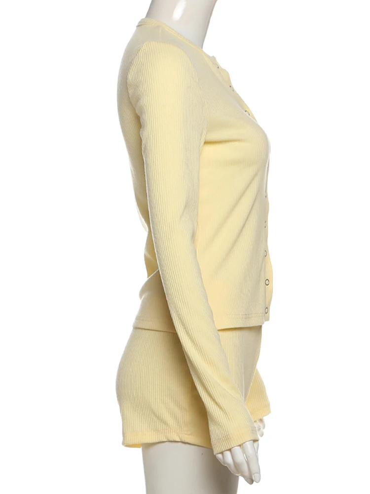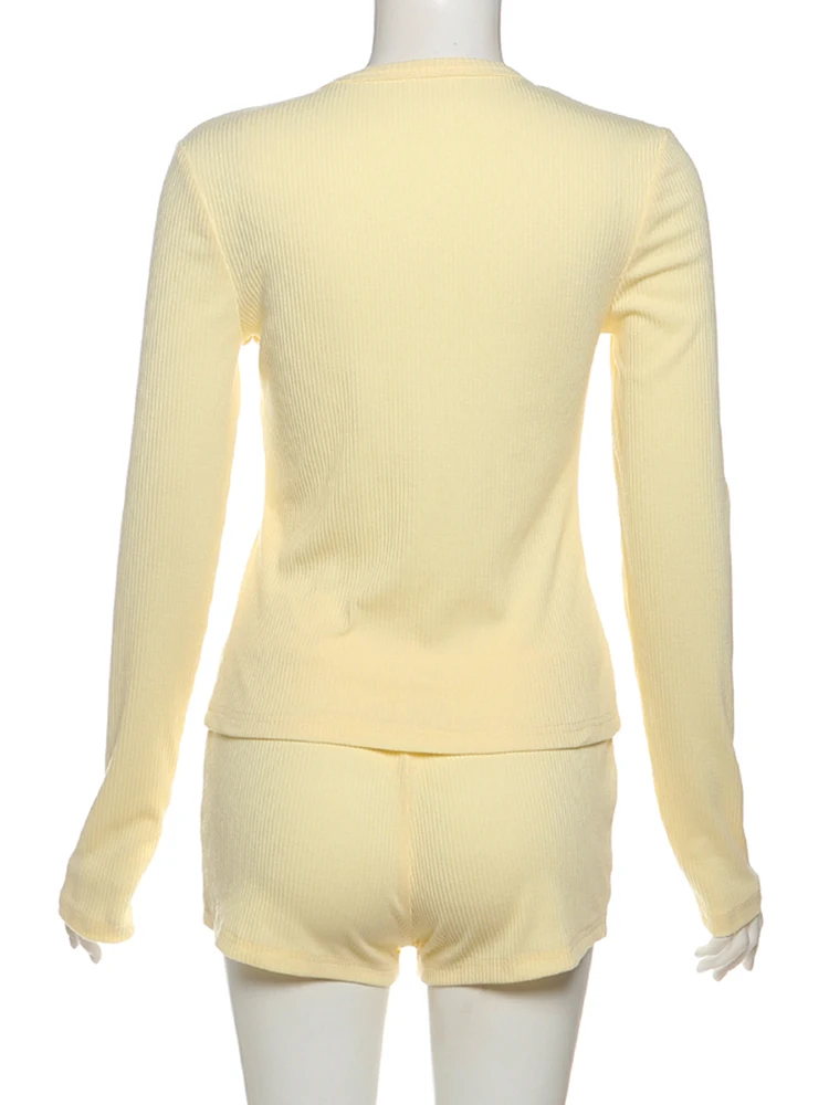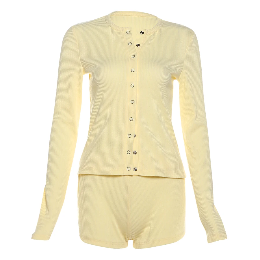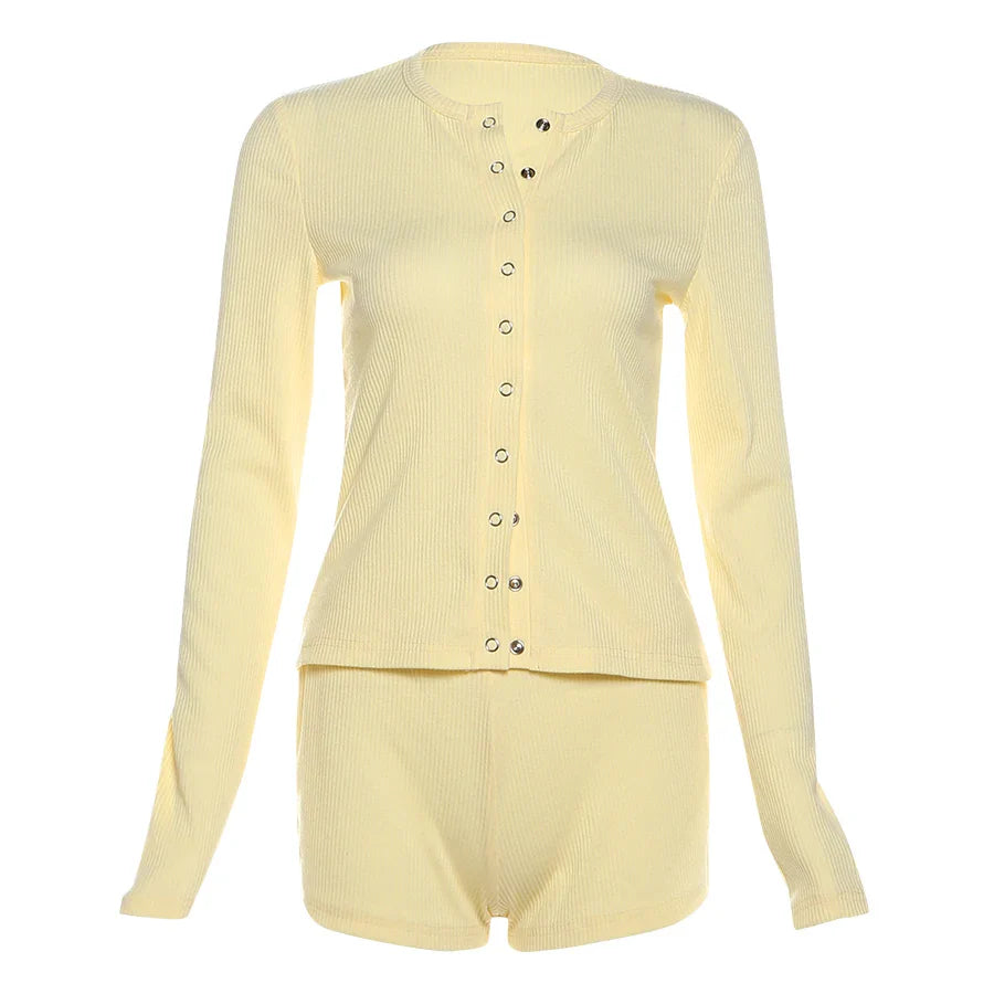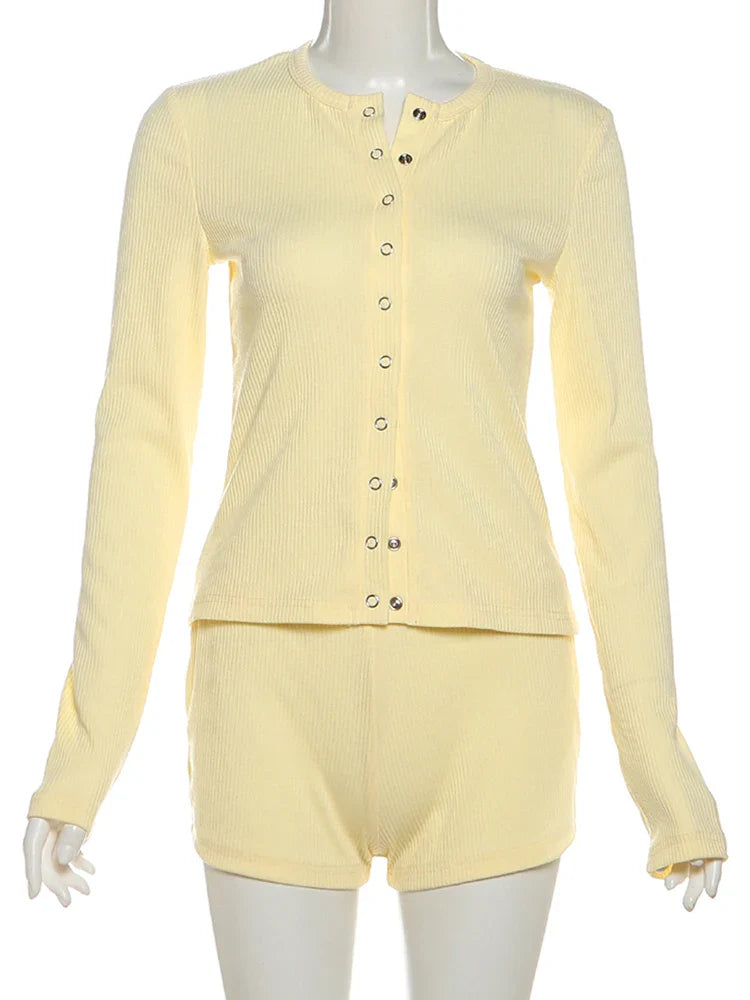 Leisure Stretch 2-Piece Set Women Single-Breasted Long Sleeves o-Neck Blouse+Basis Shorts Simple Classic Street Suits