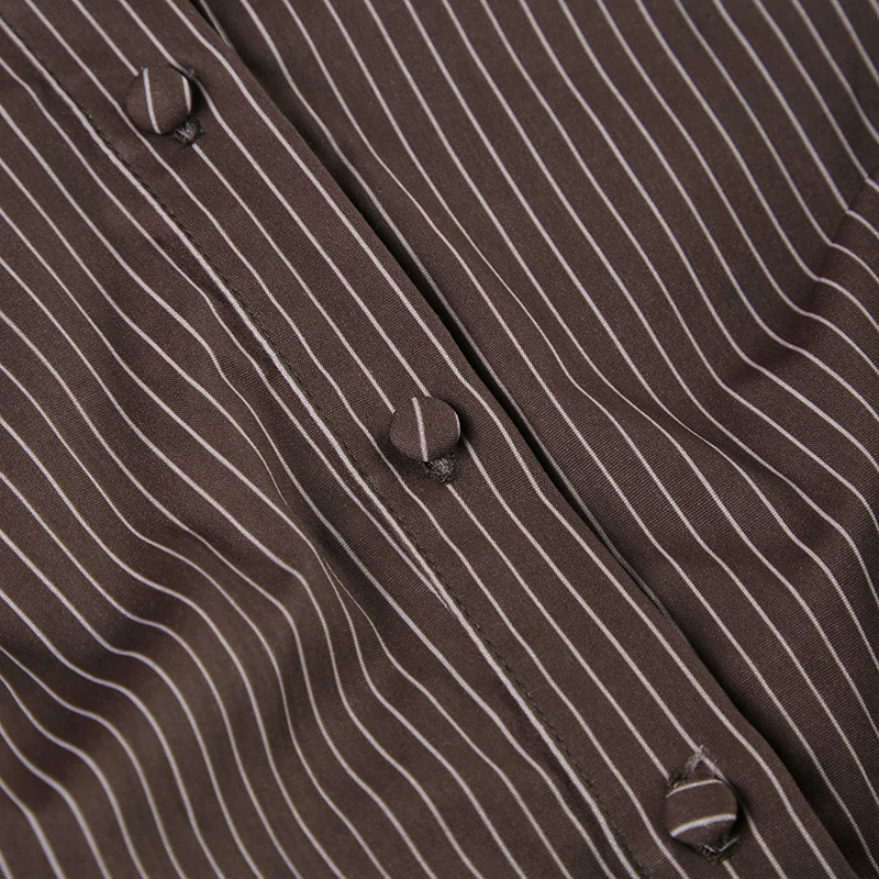 Vintage Brown Striped Blouse Women Fashion High Street Fitted Tee Shirt 2000s Casual Button Top Ladies Fall Outfits