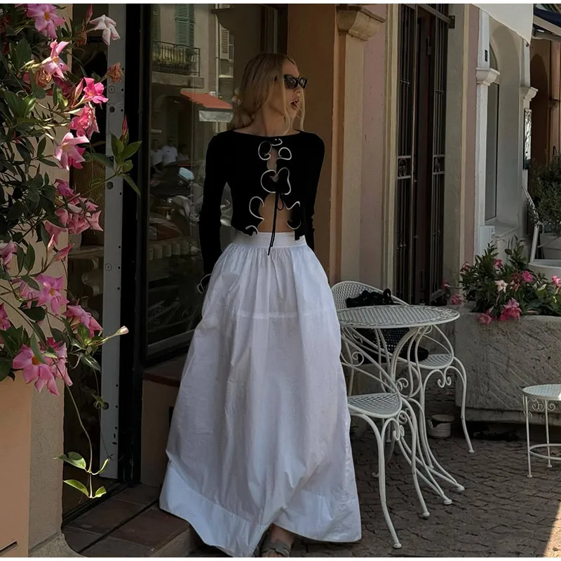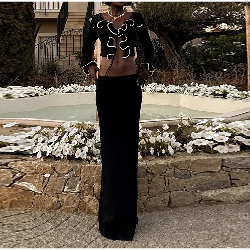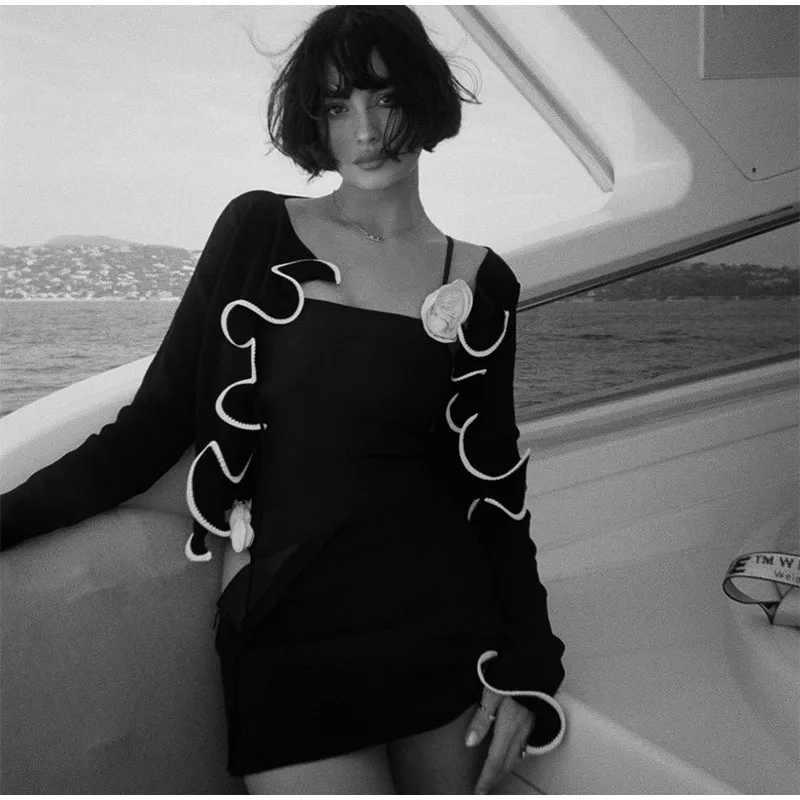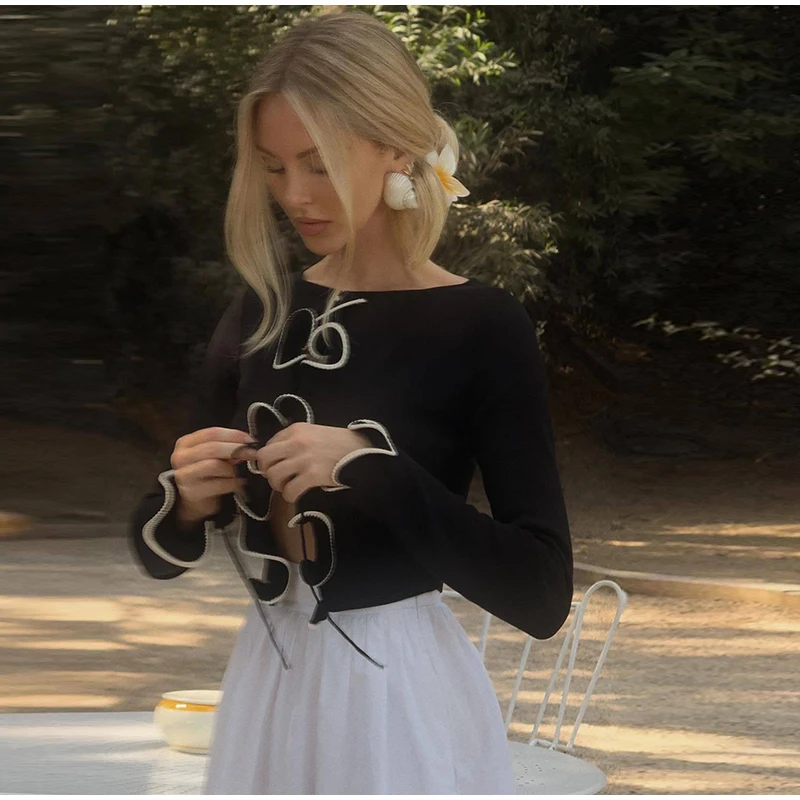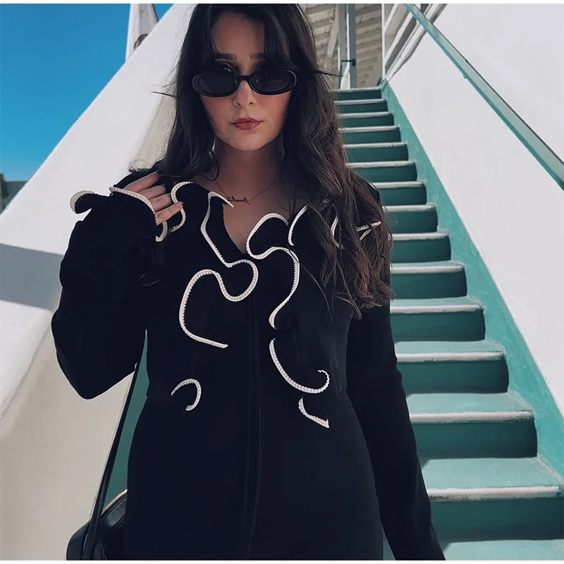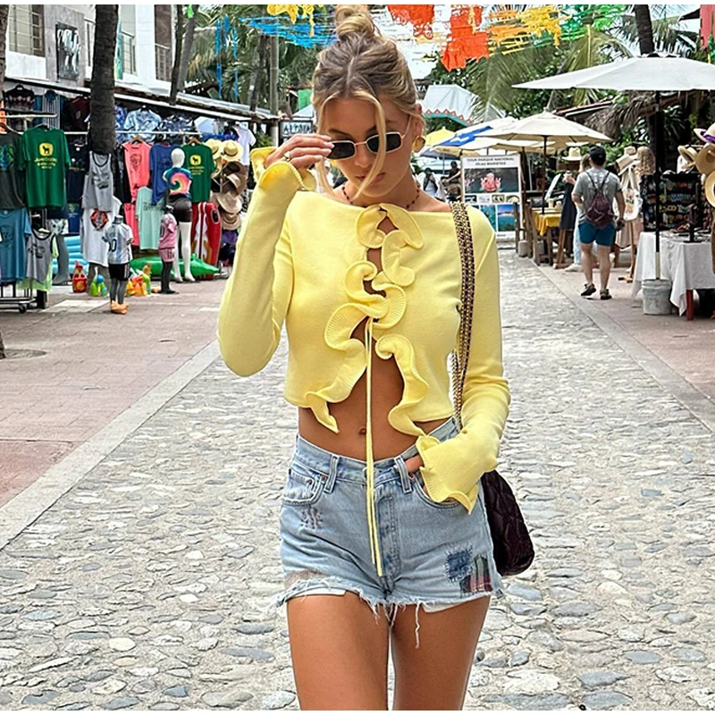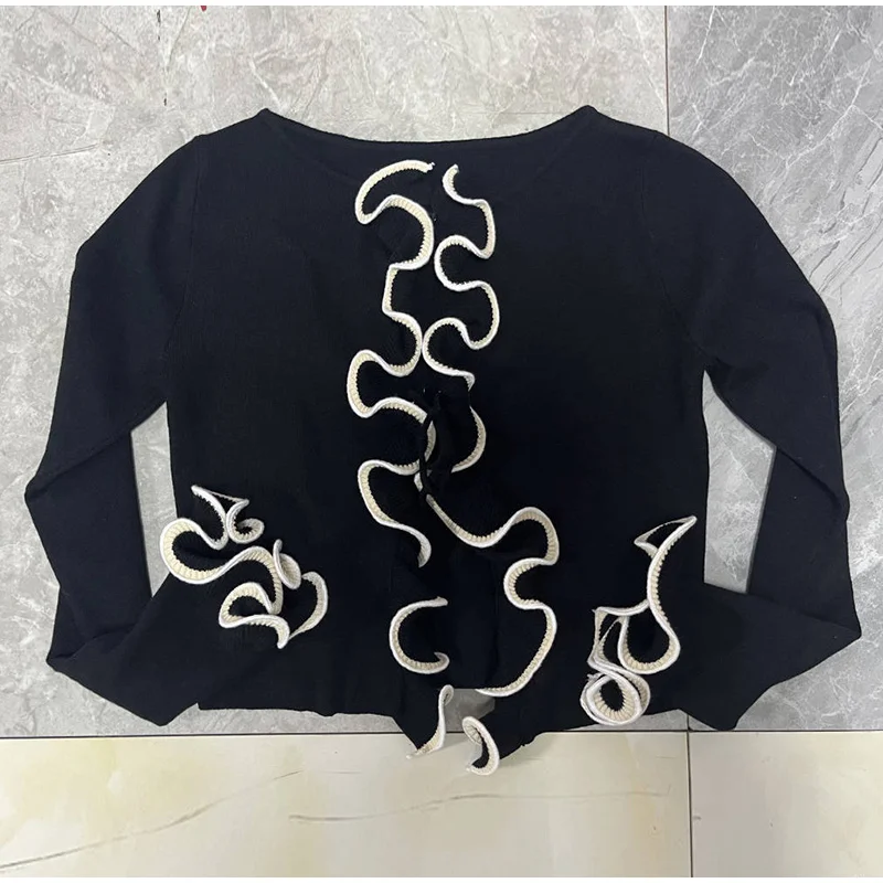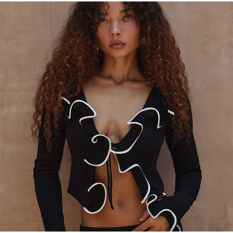 Elegant Slim Ruffle Lace Up Blouse Women Vintage Patchwork Hollow Out Short Cardigan Female Autumn Fashion Street Knitwear