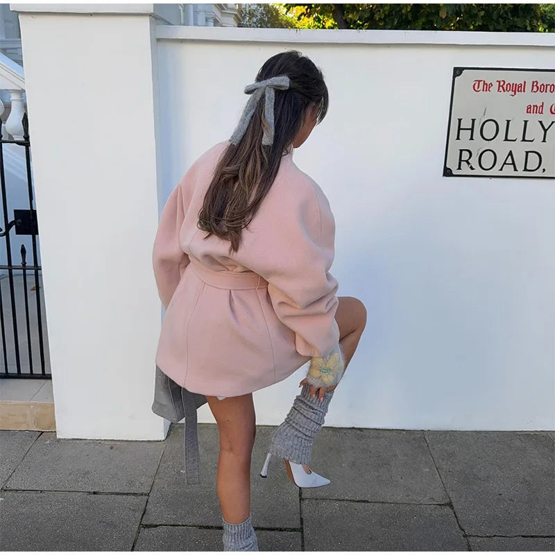Women Sweet Pink V-neck Woolen Jacket Fashion Belt Lace Up Loose Full Sleeved Outerwear Autumn Winter Lady High Street Overcoat