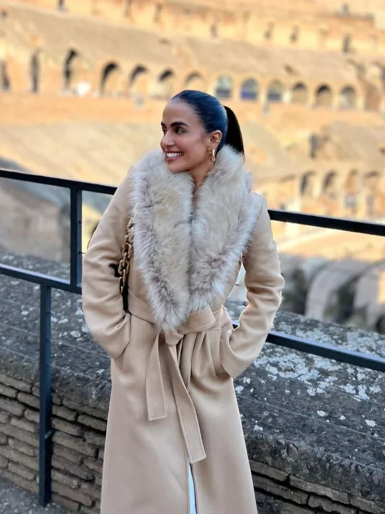 Women Faux Fur Patchwork Collar Woolen Belts Coat Button Up Pocket Casual Thicken Warm Outwear Female Winter Chic Jacket