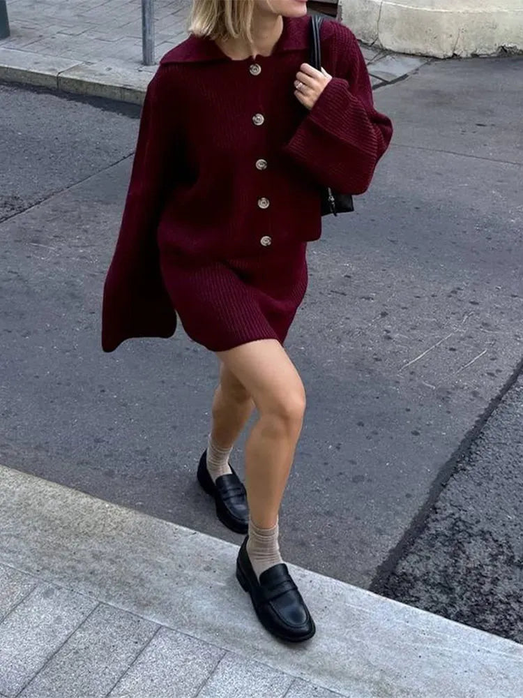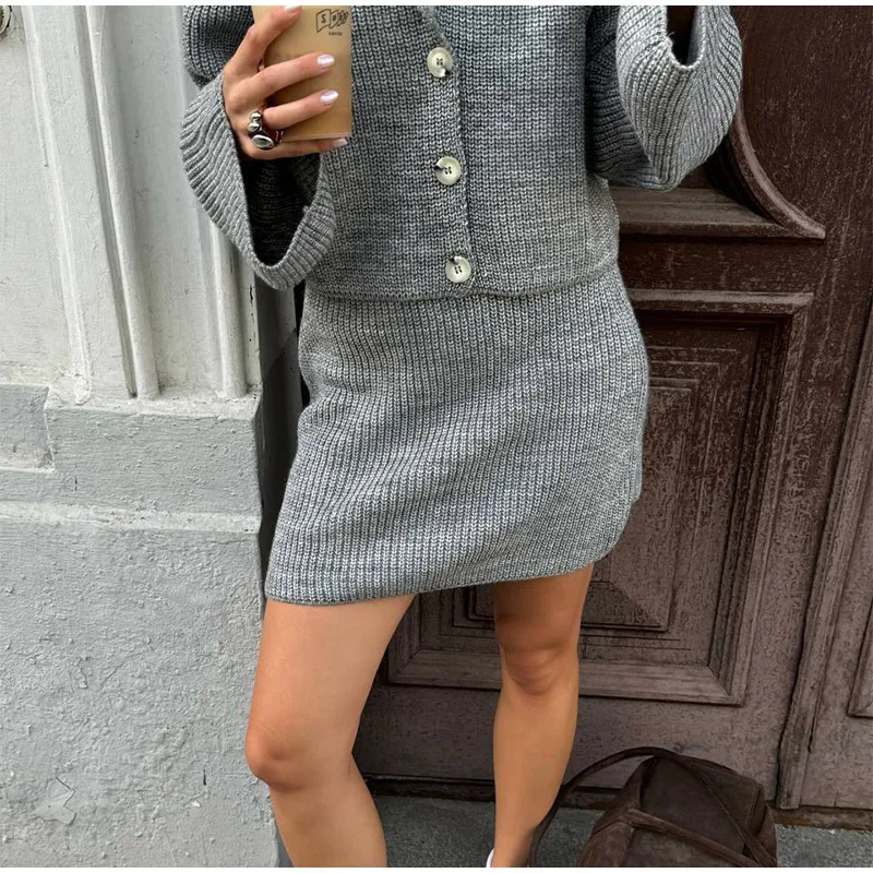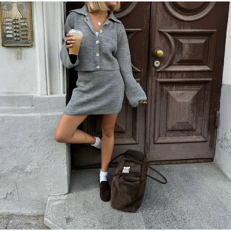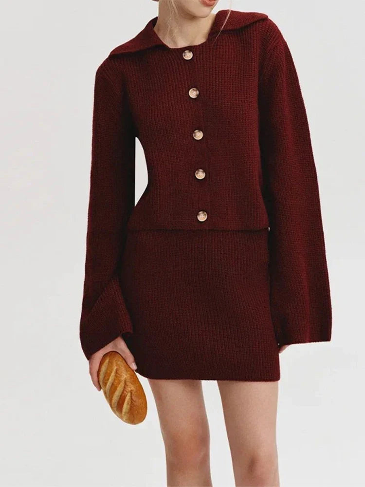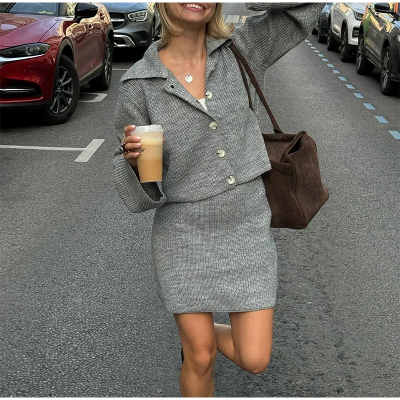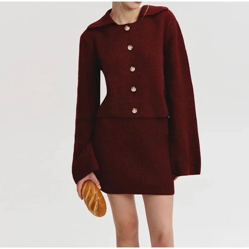 fashion Lapel Single Breasted Knitted pullover Set women chic Long Pagoda Sleeve Short Skirt suit Lady Fall Two Piece Outfits