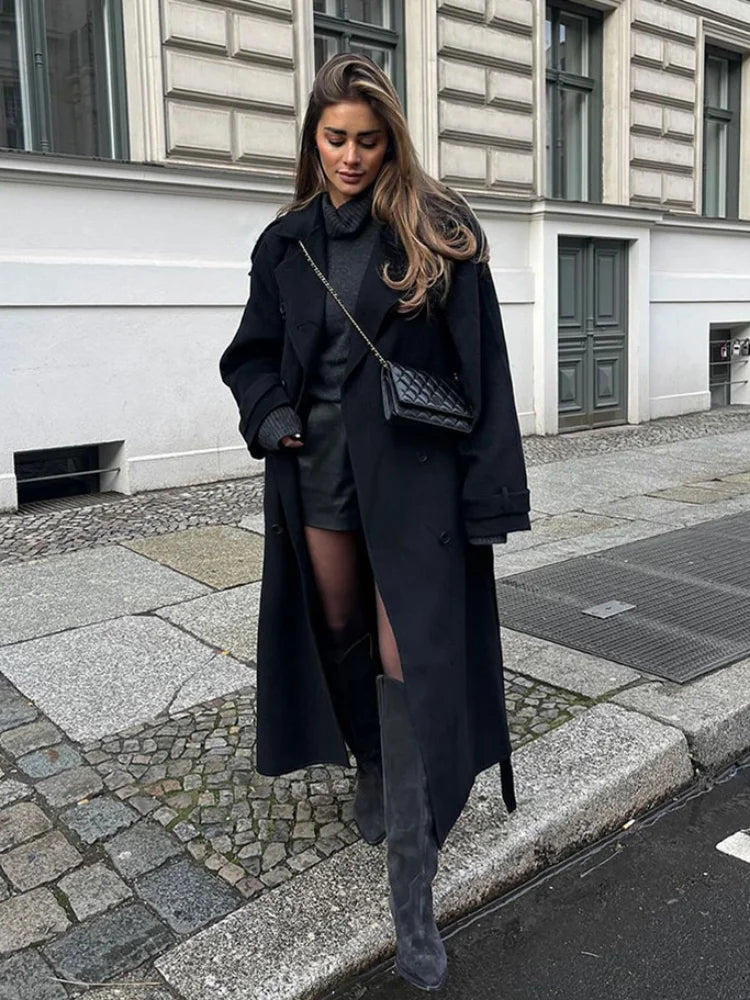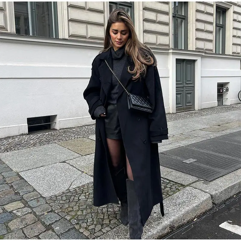 Fashion Double Breasted Women's Woolen Overcoat Elegant Lapel Long Sleeve Jacket With Belt Female New Commute Outerwear