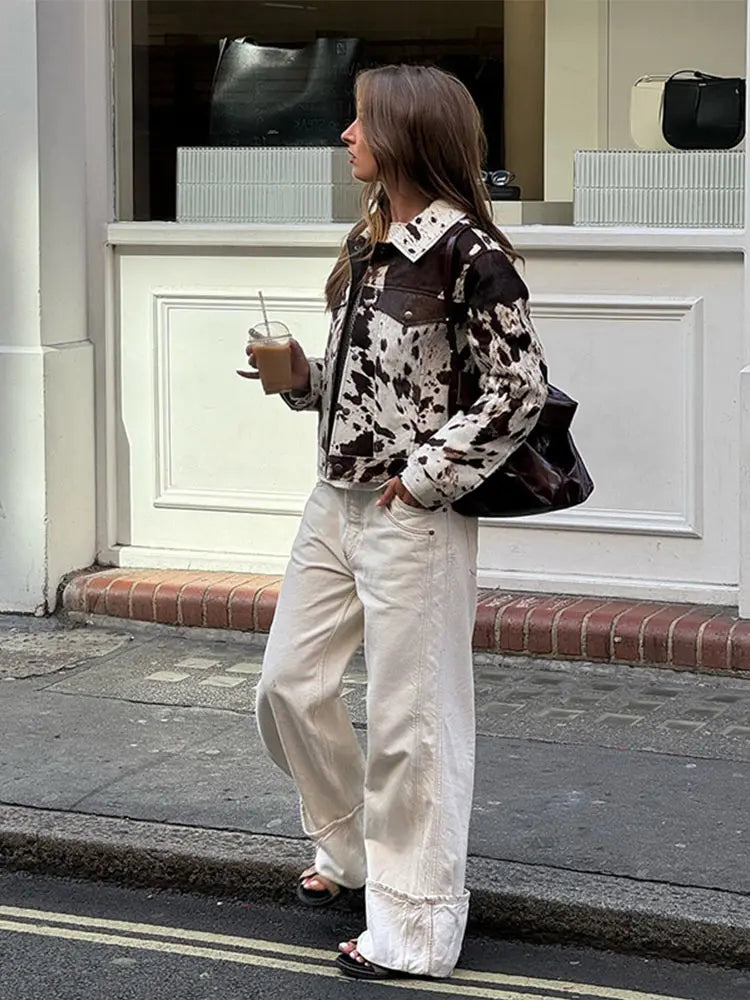 Chic Contrast Color Printed Demi-season Jacket For Women Fashion Lapel Single Breasted Lapel Coat 2024 New Lady High Streetwear