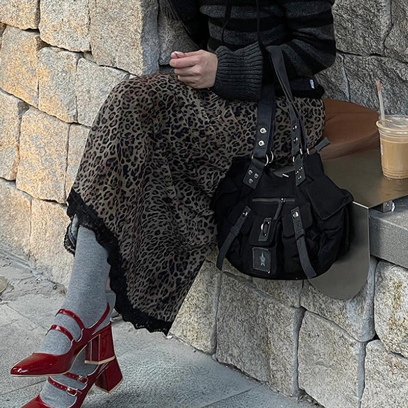 American Retro Leopard Print Stitching Lace Skirt Autumn New Fashionable Fashionable Western Style High Waist Slimming Midi Skirt for Women